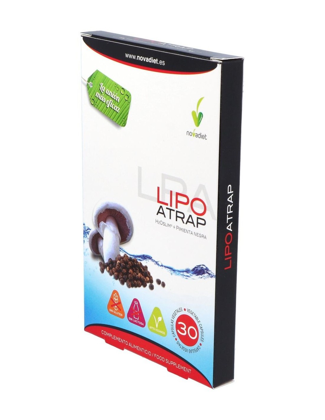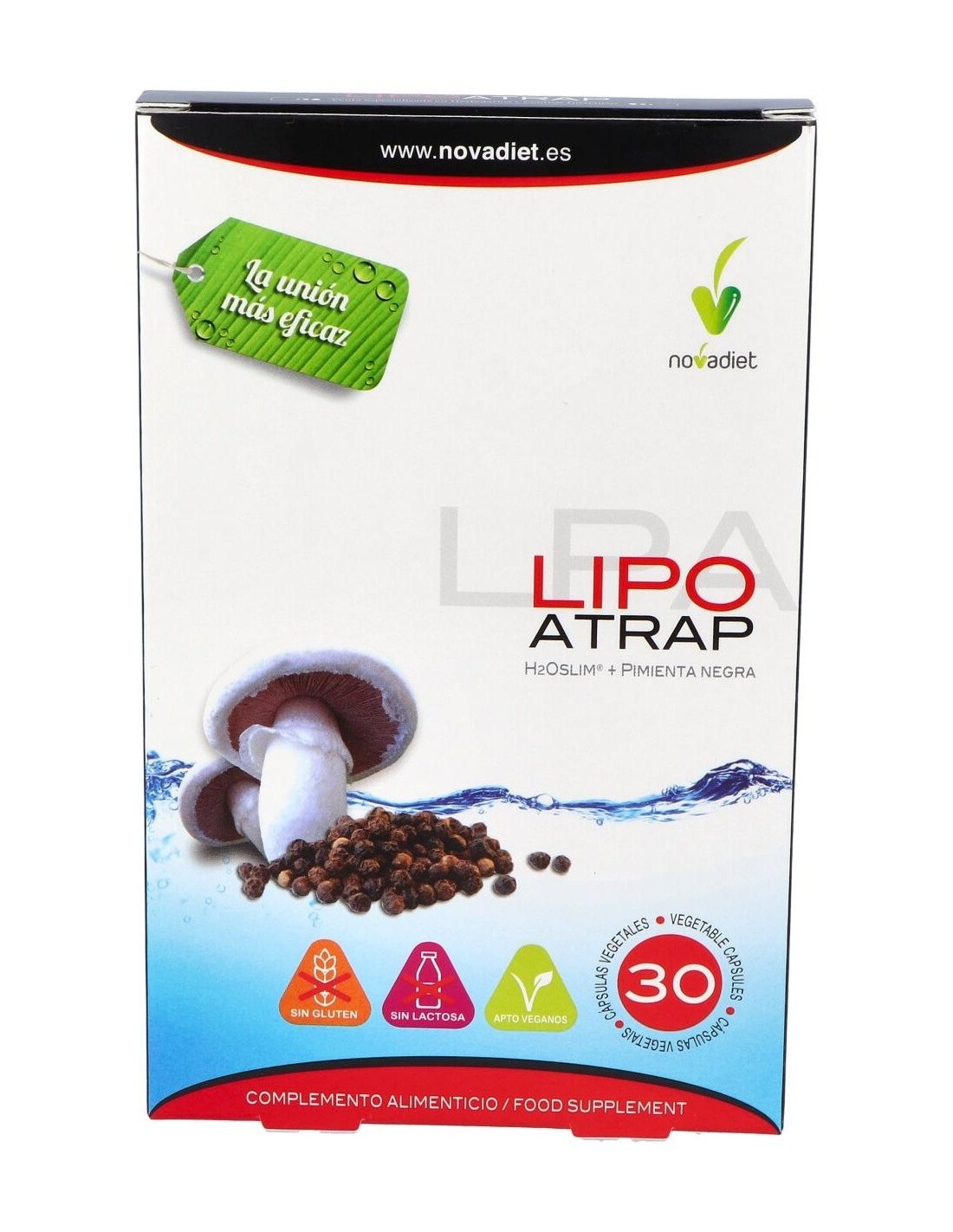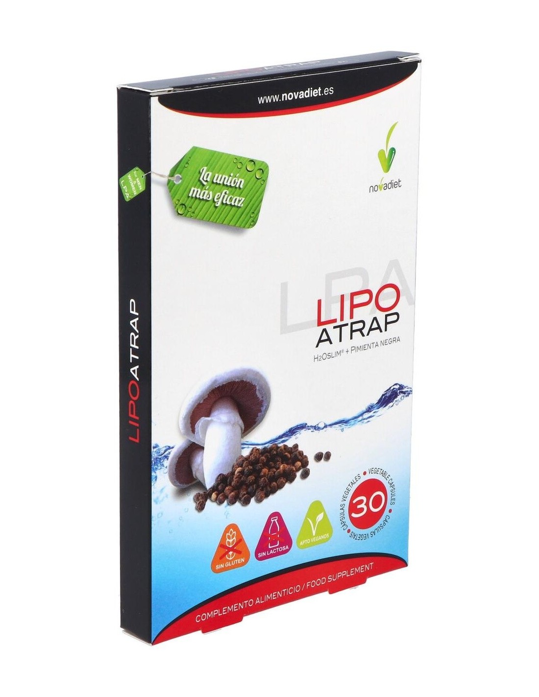 Las cápsulas Novadiet Lipoatrap te ayudarán a controlar el peso de forma saludable, combatiendo la grasa gracias a la mezcla de sus ingredientes naturales tales como la pimienta negra y el H2O Slim® proveniente de hongos europeos (Agaricus bisporus), que han sido cultivados en terreno no alcalino para aumentar los polisacáridos que te ayudarán a capturar las grasas, siendo también tu aliado para combatir la presencia de lipidos en el torrente sanguineo.