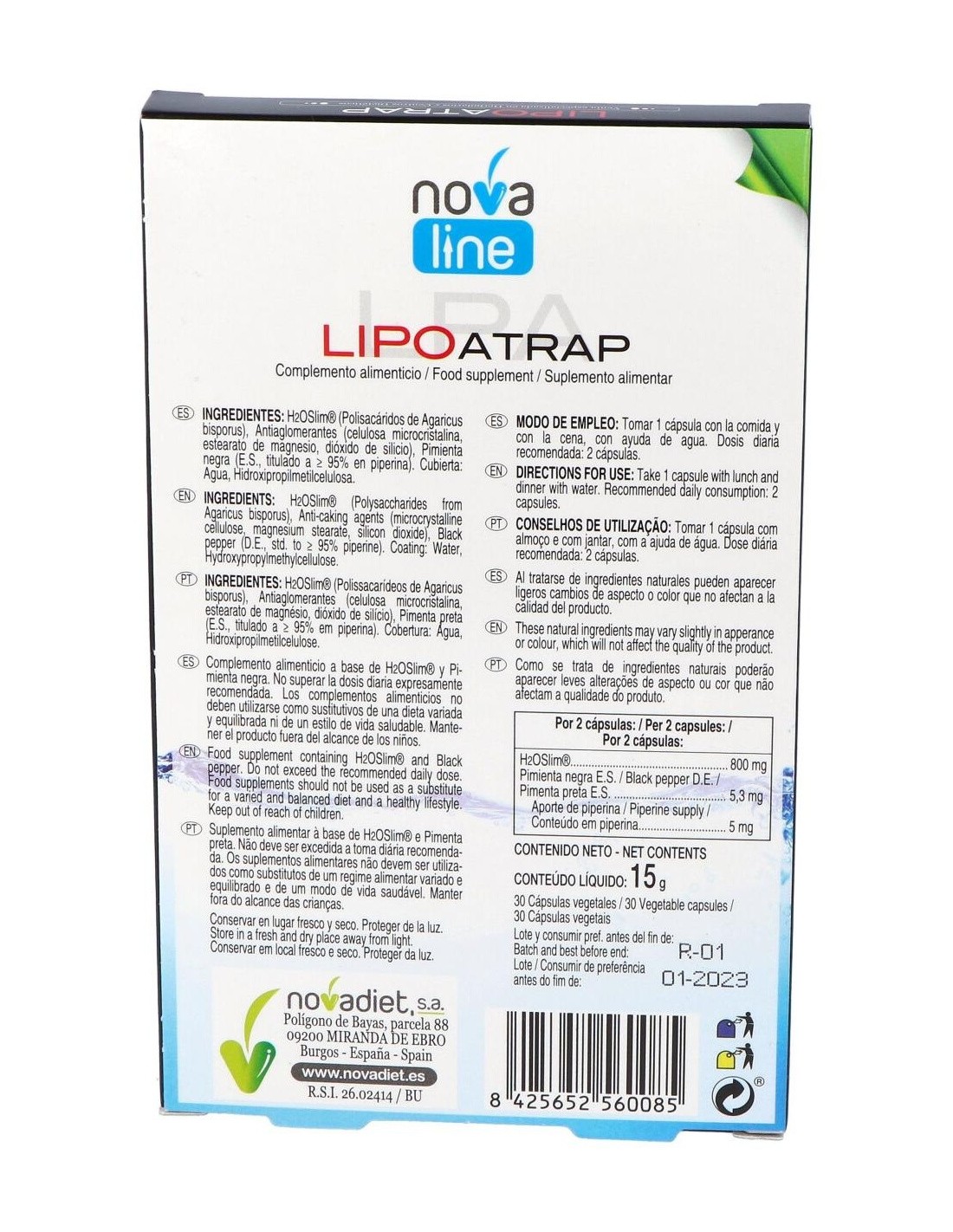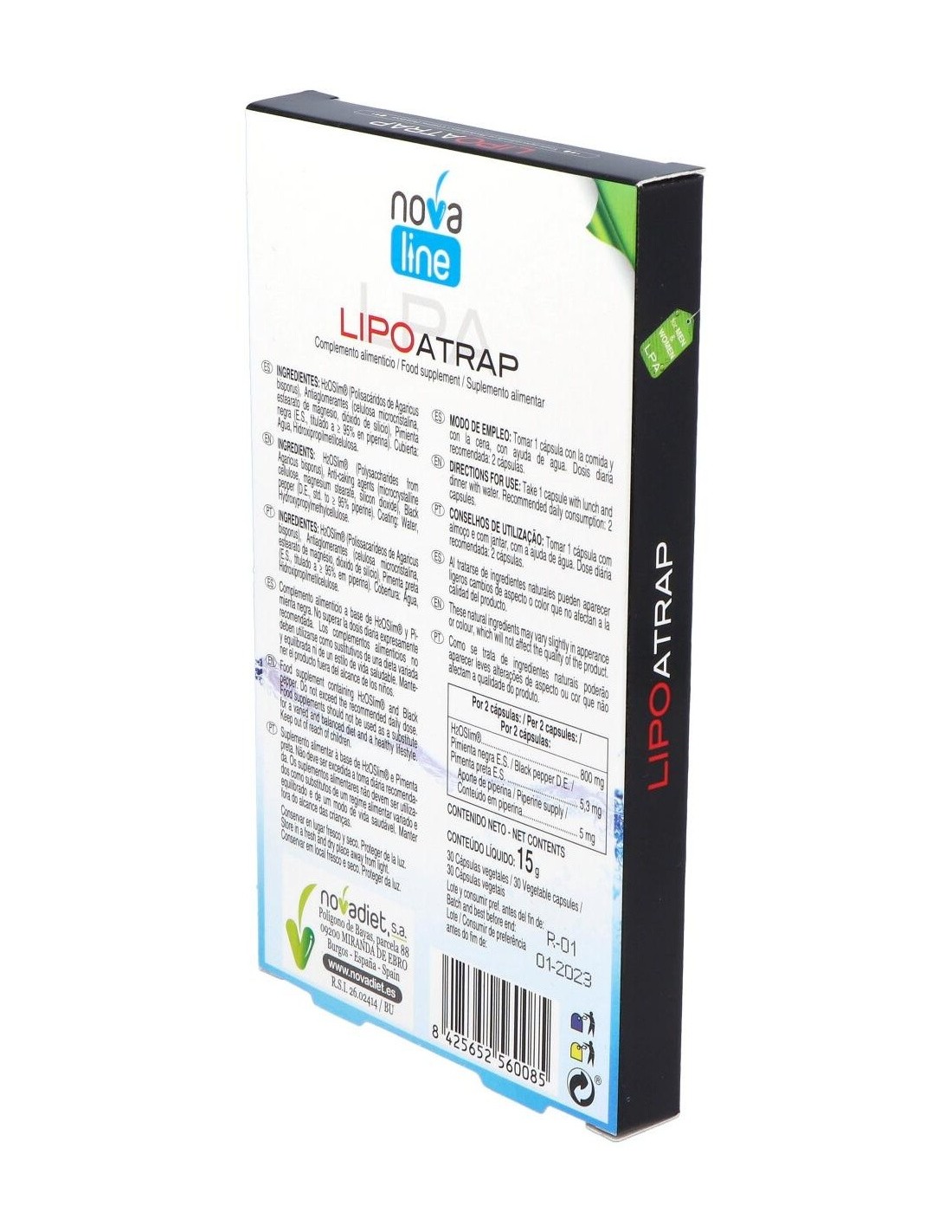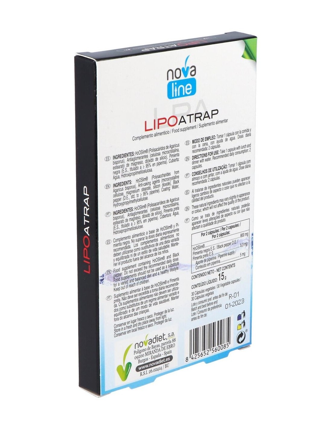 Las cápsulas Novadiet Lipoatrap te ayudarán a controlar el peso de forma saludable, combatiendo la grasa gracias a la mezcla de sus ingredientes naturales tales como la pimienta negra y el H2O Slim® proveniente de hongos europeos (Agaricus bisporus), que han sido cultivados en terreno no alcalino para aumentar los polisacáridos que te ayudarán a capturar las grasas, siendo también tu aliado para combatir la presencia de lipidos en el torrente sanguineo.