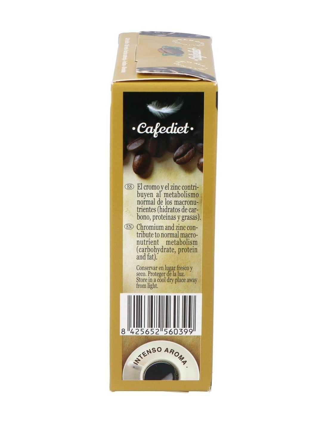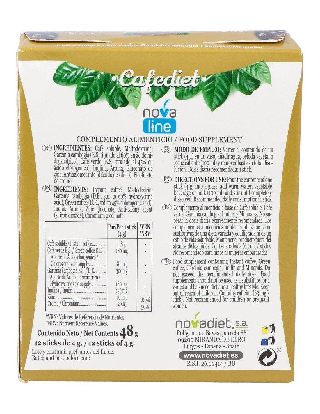 Café soluble, Maltodextrina, Garcinia cambogia (E.S. titulado al 60% en ácido hidroxicítrico), Café verde (E.S., titulado al 45% en ácido clorogénico), Inulina, Aroma, Gluconato de zinc, Antiaglomerante (dióxido de silicio), Picolinato de cromo.