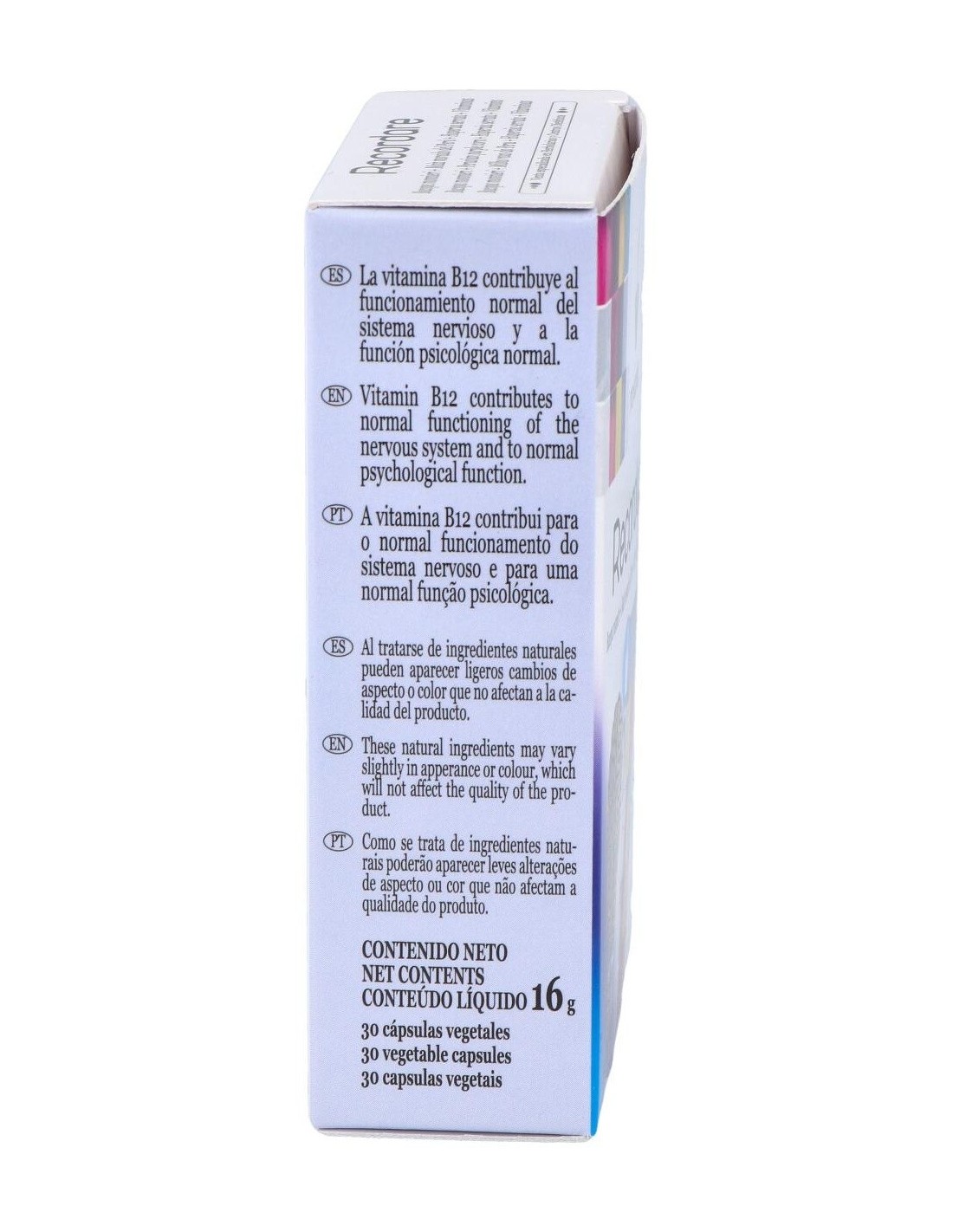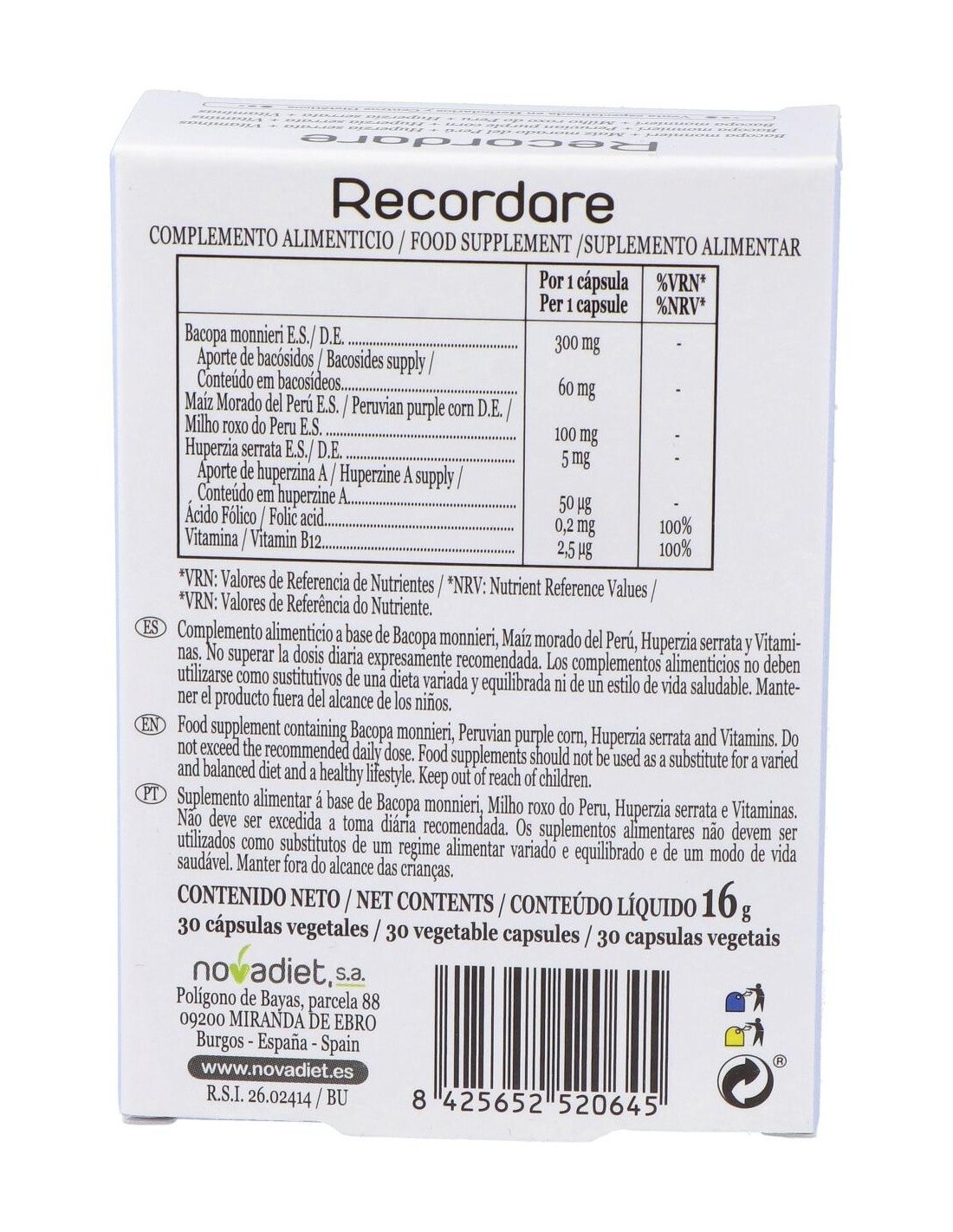 Bacopa monnieri (E.S., titulado al 20% en bacósidos), Maíz morado del Perú (E.S, ratio 10:1), Maltodextrina, Antiaglomerantes (estearato de magnesio, dióxido de silicio), Huperzia serrata (E.S., titulado al 1% en huperzina A), Ácido fólico, Vitamina B12 (cianocobalamina). Cubierta: Agua, Hidroxipropilmetilcelulosa.