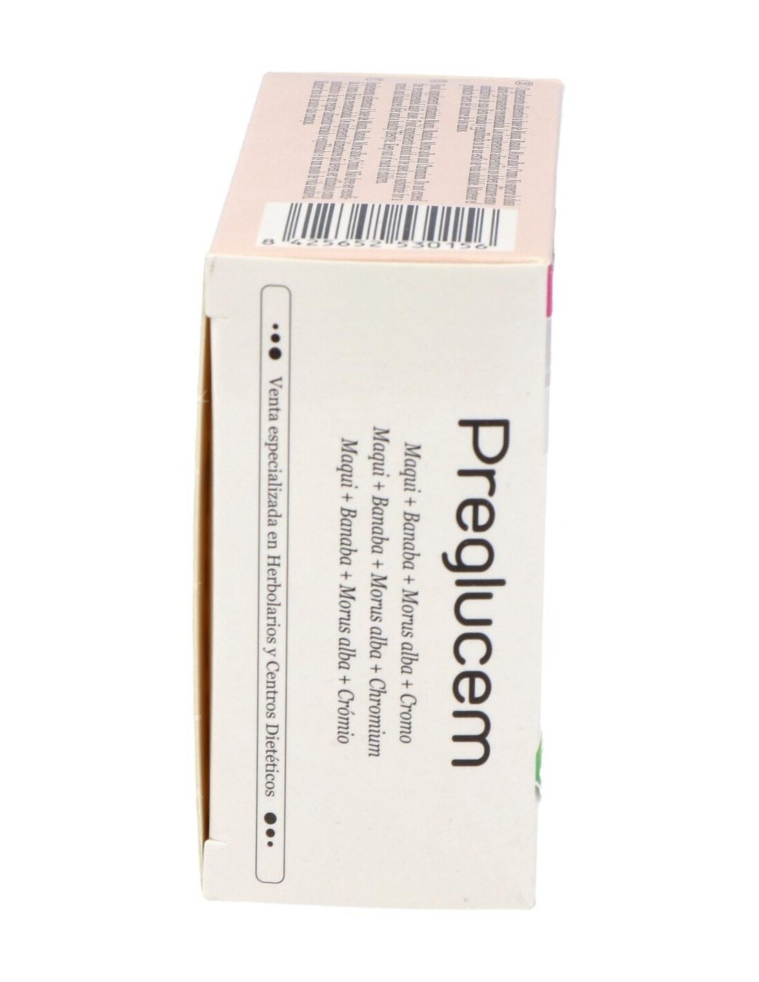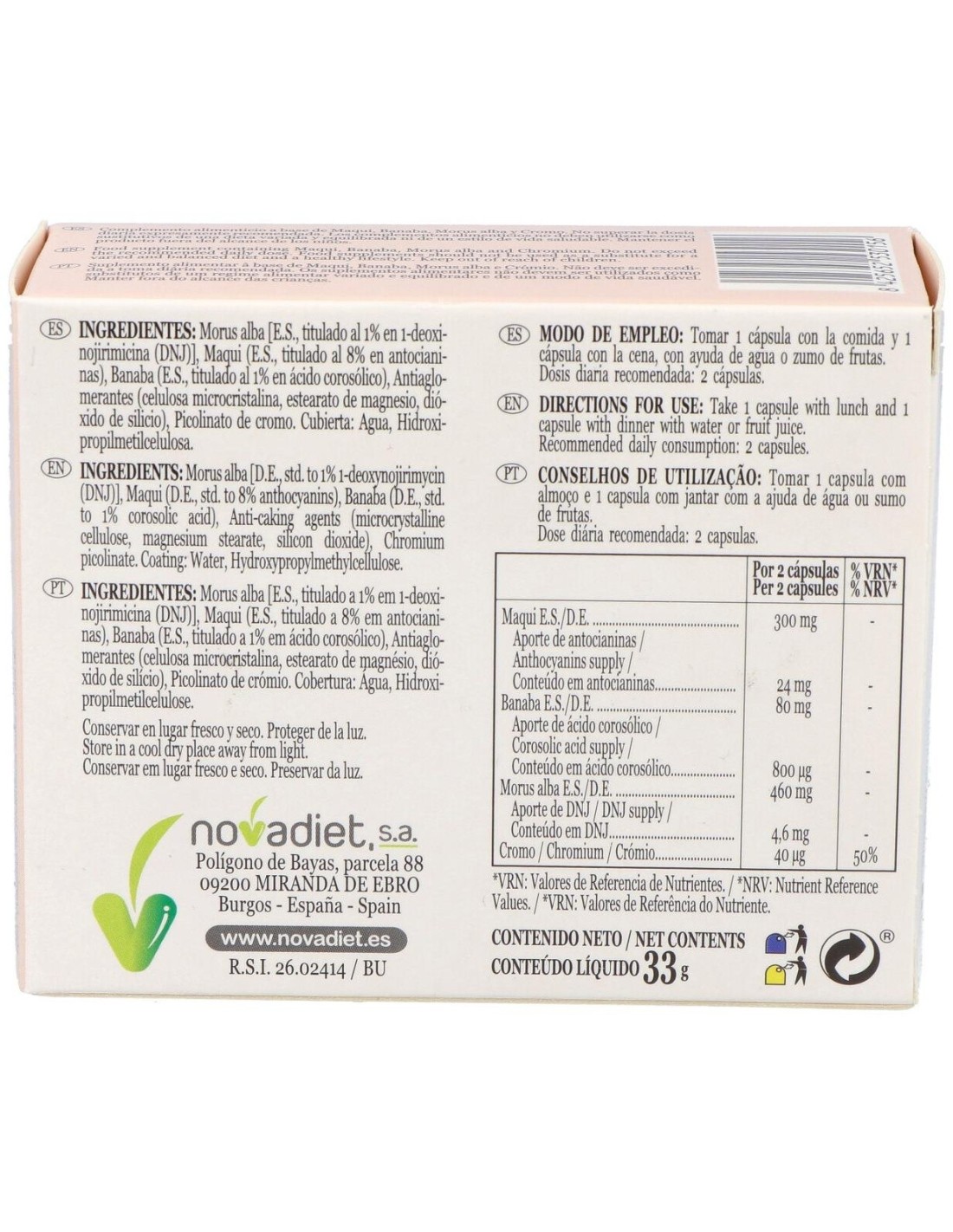 Morus alba [E.S., titulado al 1% en 1-deoxinojirimicina (DNJ)], Maqui (E.S., titulado al 8% en antocianinas), Banaba (E.S., titulado al 1% en ácido corosólico), Antiaglomerantes (celulosa microcristalina, estearato de magnesio, dióxido de silicio), Picolinato de cromo. Cubierta: Agua, Hidroxipropilmetilcelulosa.