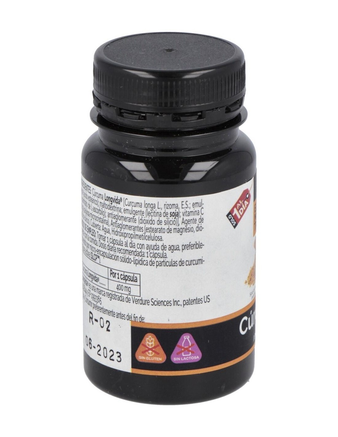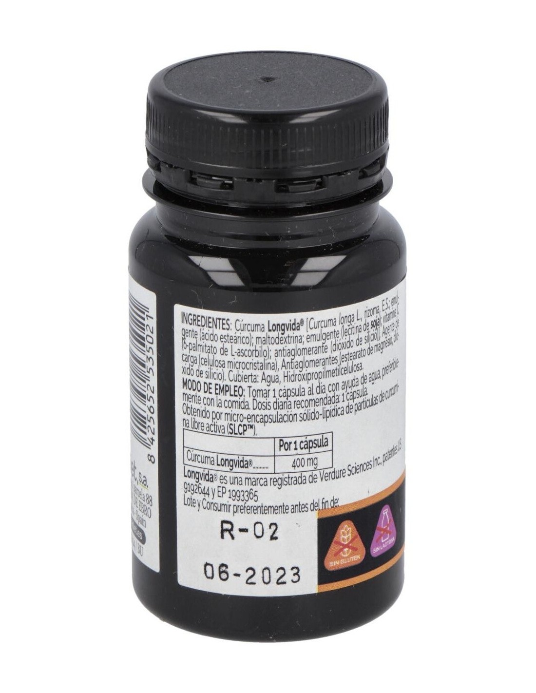 Cúrcuma Longvida® [Curcuma longa L., rizoma, E.S.: emulgente (ácido esteárico): maltodextrina: emulgente (lecitina de soja): vitamina C (6-palmitato de L-ascorbilo): antiaglomerante (dióxido de silicio)], Agente de carga (celulosa microcristalina), Antiaglomerantes (estearato de magnesio, dióxido de silicio). Cubierta: Agua, Hidroxipropilmetilcelulosa.