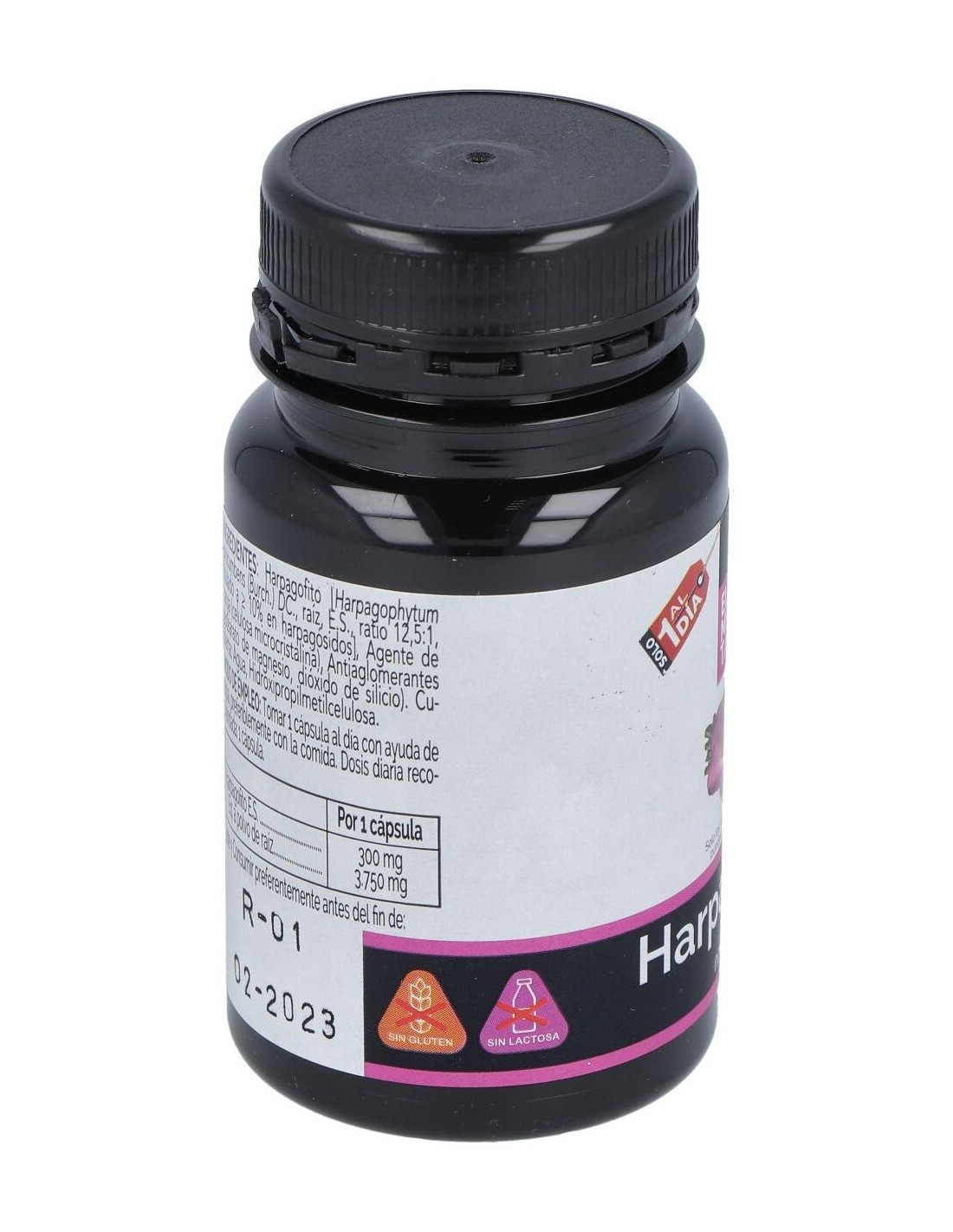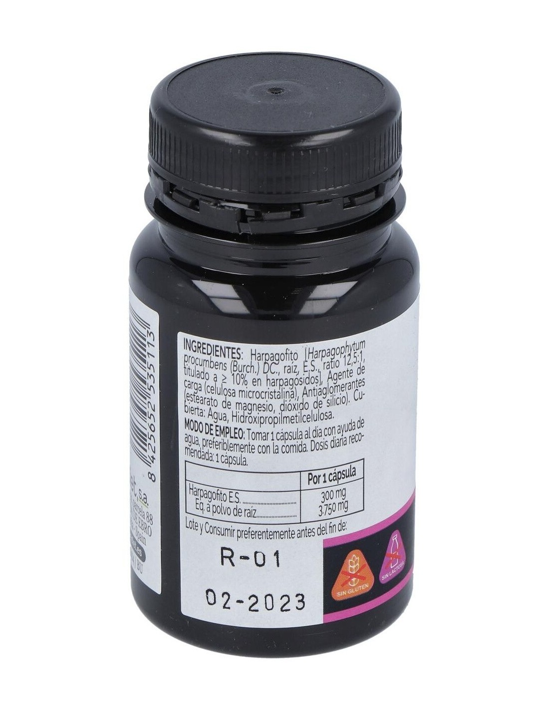 Harpagofito [Harpagophytum procumbens (Burch.) DC., raíz, E.S., ratio 12,5:1, titulado a = 10% en harpagósidos], Agente de carga (celulosa microcristalina), Antiaglomerantes (estearato de magnesio, dióxido de silicio). Cubierta: Agua, Hidroxipropilmetilcelulosa.