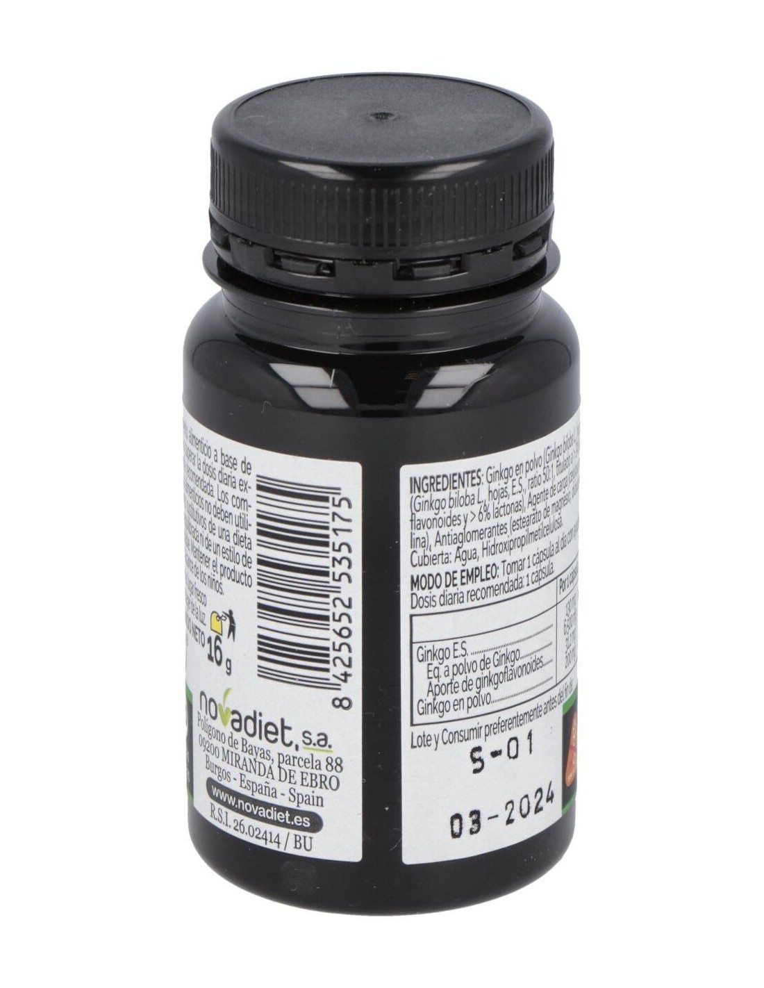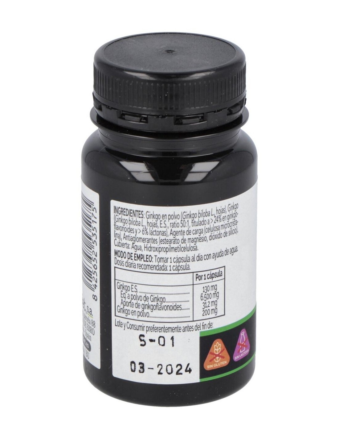 Ginkgo en polvo (Ginkgo biloba L., hojas), Ginkgo (Ginkgo biloba L., hojas, E.S., ratio 50:1, titulado a > 24% en ginkgoflavonoides y > 6% lactonas), Agente de carga (celulosa microcristalina), Antiaglomerantes (estearato de magnesio, dióxido de silicio). Cubierta: Agua, Hidroxipropilmetilcelulosa.