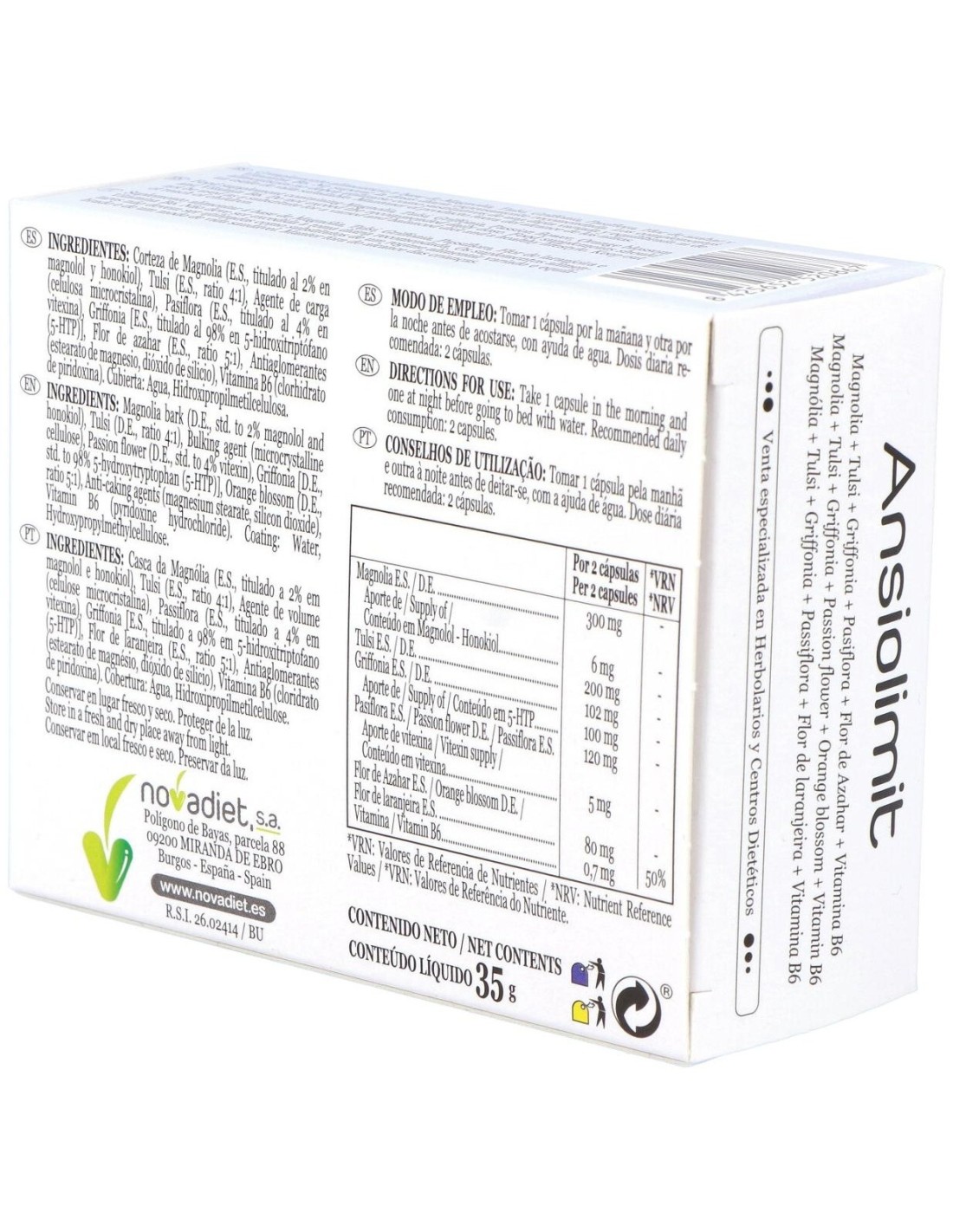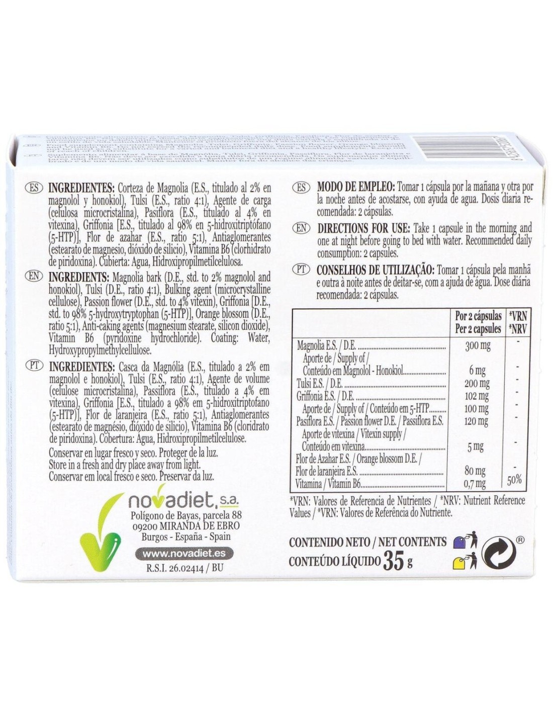 Corteza de magnolia (e.s. titulado al 2% de magnolol y honokiol), tulsi (e.s. ratio 4:1), agente de carga (celulosa microcristalina), pasiflora (e.s. titulado al 4% de vitexina), grifonia (e.s. titulado al 98% en 5-hidroxitriptófano), flor de azahar (e.s. ratio 5:1), antiaglomerante (estearato de magnesio, dióxido de silicio), vitamina B6 (clorhidrato de piridoxina), cubierta: agua, hidroxipropilmetilcelulosa.