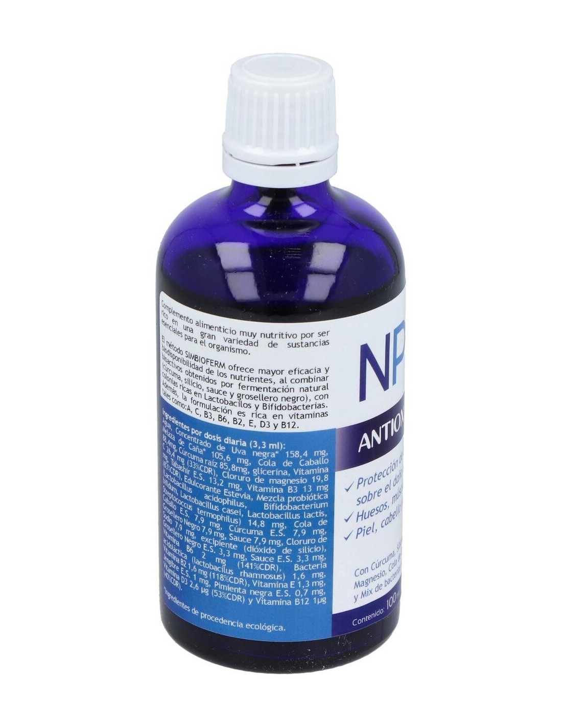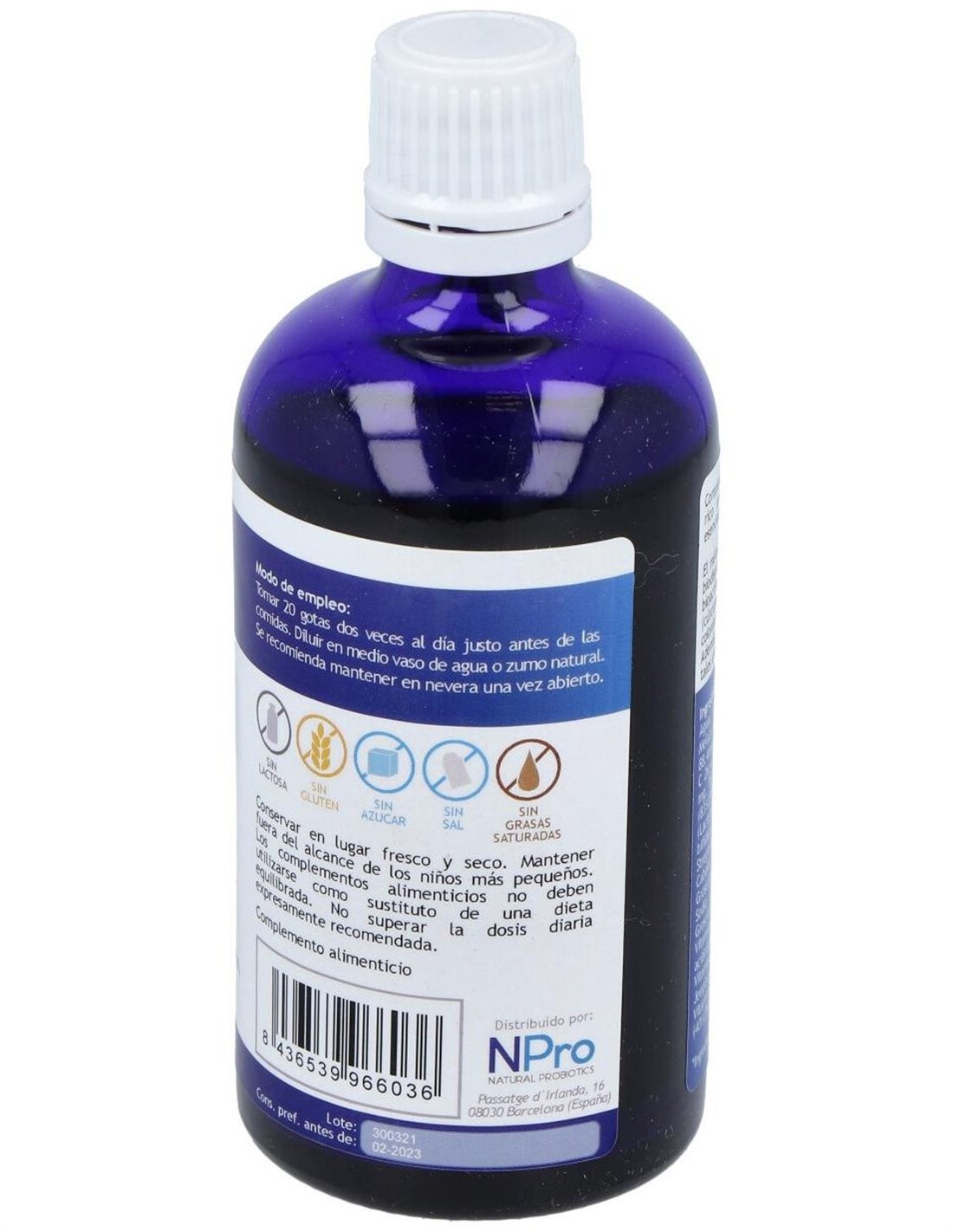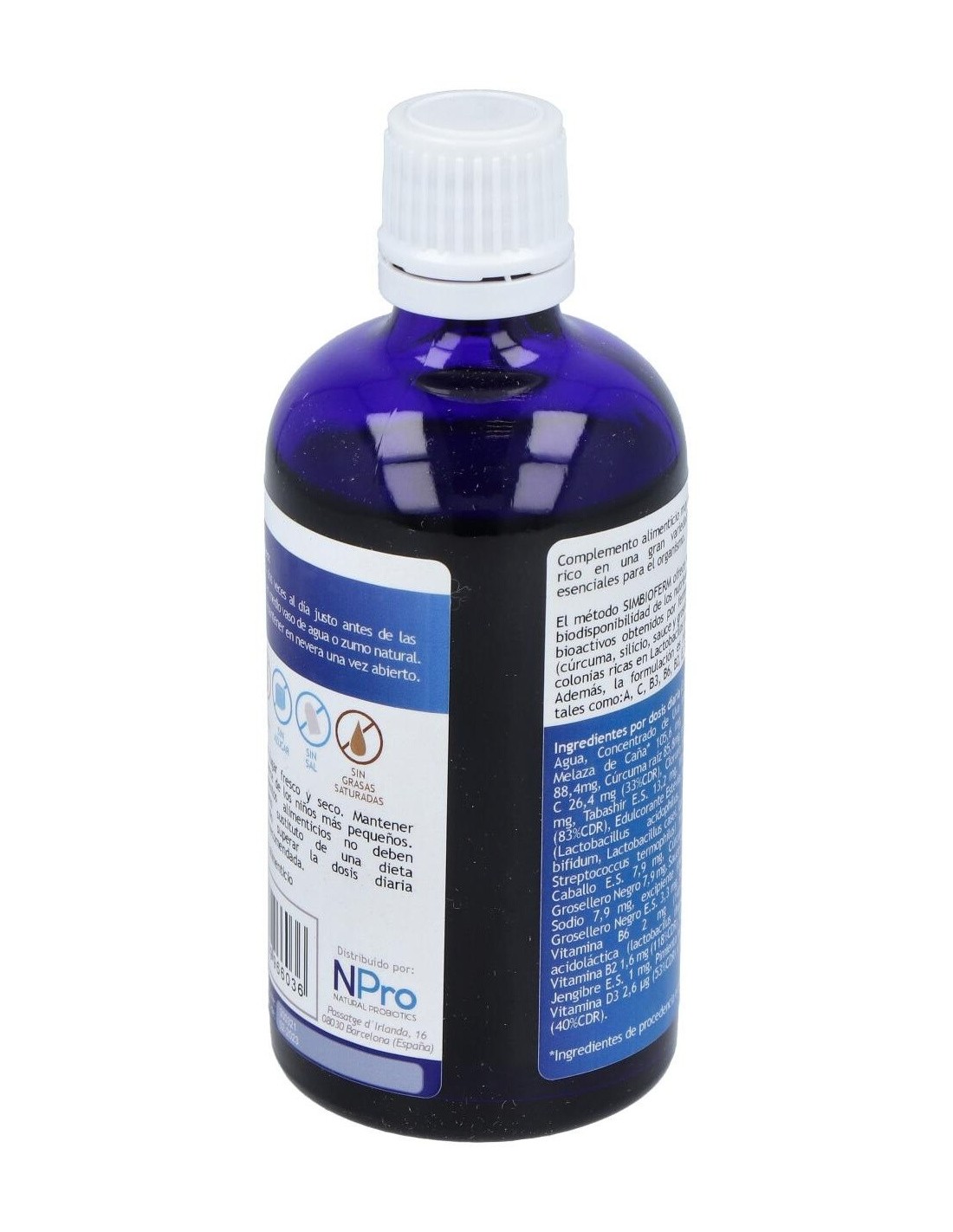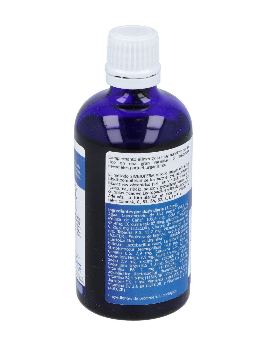 Mosto concentrado de Uva negra* (Vitis vinifera), Melaza de caña* (Saccharum officinarum), Cola de caballo* (Equisetum arvense), Curcuma longa*, Humectante (Glicerina vegetal), Vitamina C-Ácido ascórbico, Cloruro de Magnesio, Tabashir* (Bambusa vulgaris), Vitamina B3-Niacina, Estevia* (Stevia rebaudiana: Edulcorante: glucósidos de esteviol), Bacterias acidolácticas (Lactobacillus acidophilus, Bifidobacterium bifidum, Lactobacillus casei, Lactobacillus lactis, Streptococcus thermophilus, Lactobacillus rhamnosus), Grosellero negro* (Ribes nigrum), Sauce* (Salix alba), Sal marina* (Cloruro de sodio), Dióxido de silicio, Vitamina B6 Piridoxina clorhidrato, Vitamina B2-Riboflavina, Vitamina E-Tocoferol, Jengibre* (Zingiber officinale), Pimienta negra* (Piper nigrum), Vitamina D3-Colecalciferol y Vitamina B12- Cianocobalamina.