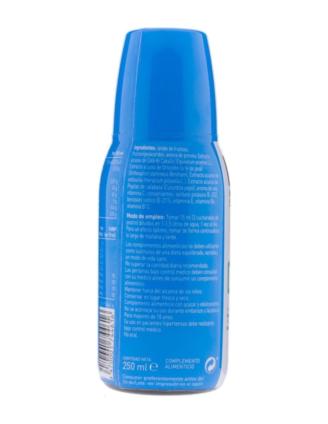 Por 100 ml:\ Jarabe de fructosa; fructooligosacaridos (5 g); aroma de pomelo; Extracto acuoso de Cola de Caballo (Equisetum arvense L.) (3,33 g); Extracto acuoso de Ortosifon (o té de java) (Orthosiphon stamineus Bentham) (3,33 g), Extracto acuoso de vellosilla (Hieracium pilosella L.) (3,33 g), Extracto acuoso de Pepitas de calabaza (Cucurbita pepo) (3,33 g); aroma de uva; vitamina C; conservantes: sorbato potásico (E-202), benzoato sódico (E-211); vitamina E; vitamina B6; vitamina B12.
