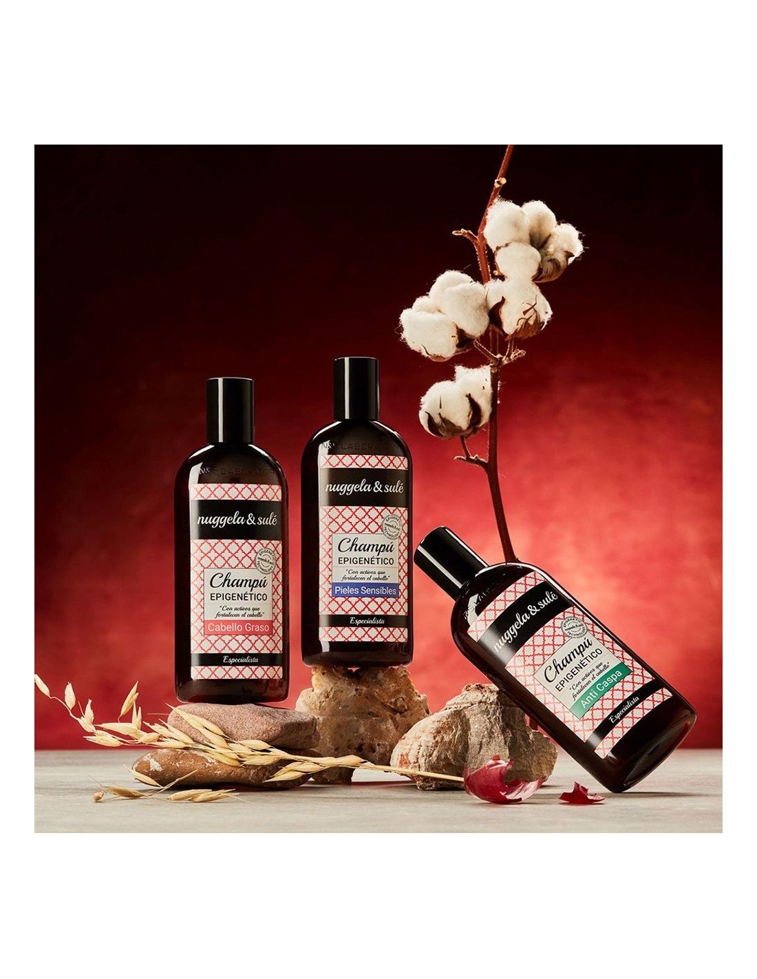 El champú epigenético pieles sensibles de Nuggela & Sulé tiene una innovación capilar ya que interviene en la activación de los genes relacionados con el crecimiento capilar. Con olor a heno y limón.