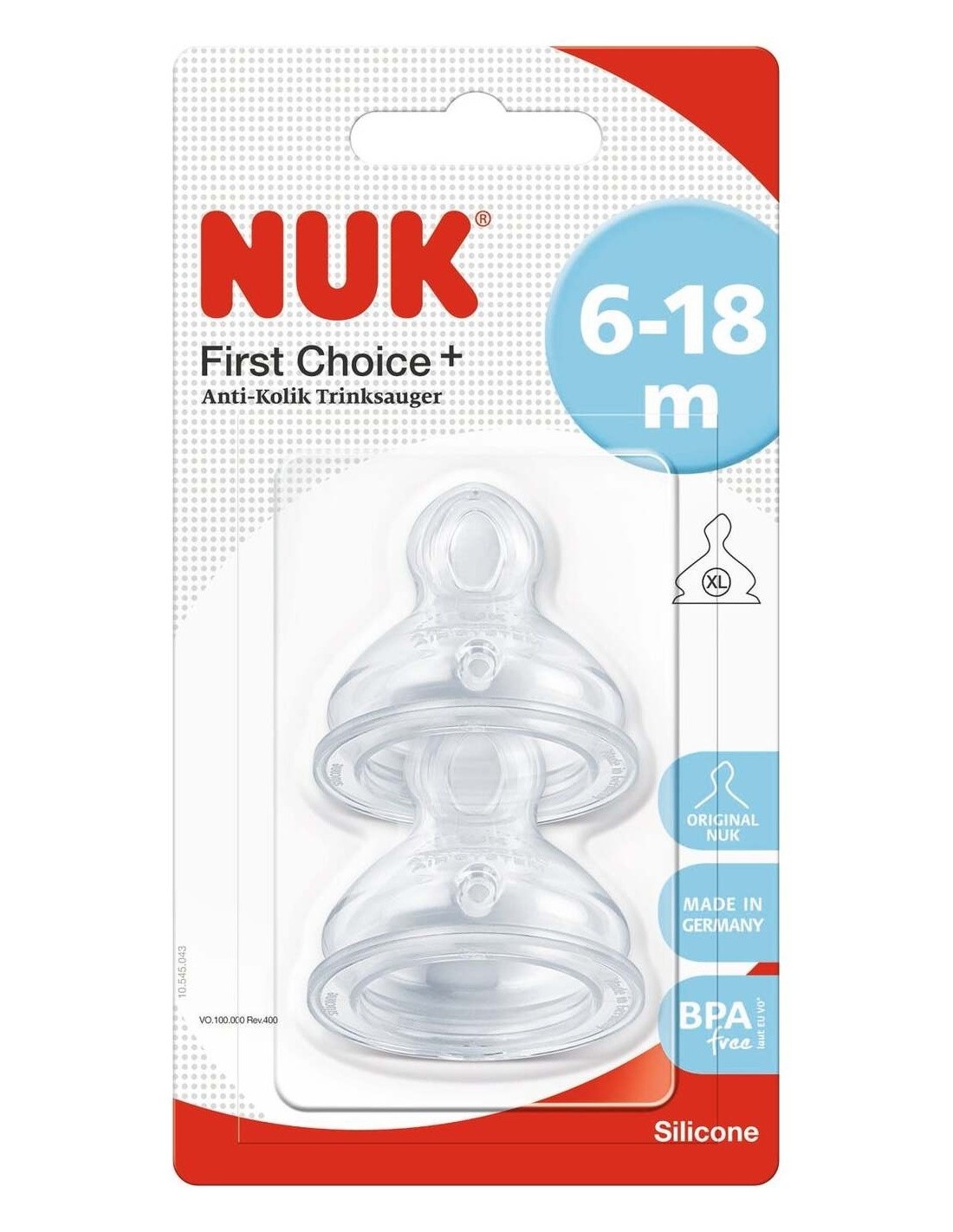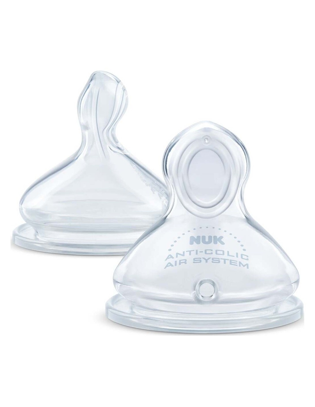 Tetina de Silicona con forma anatómica exclusiva que se adapta perfectamente a la mandíbula del bebé, de 6-18 meses. XL (orificio grande = alimentos muy espesos). Con sistema de ventilación NUK AIR SYSTEM mejorado que ayuda a prevenir los cólicos.