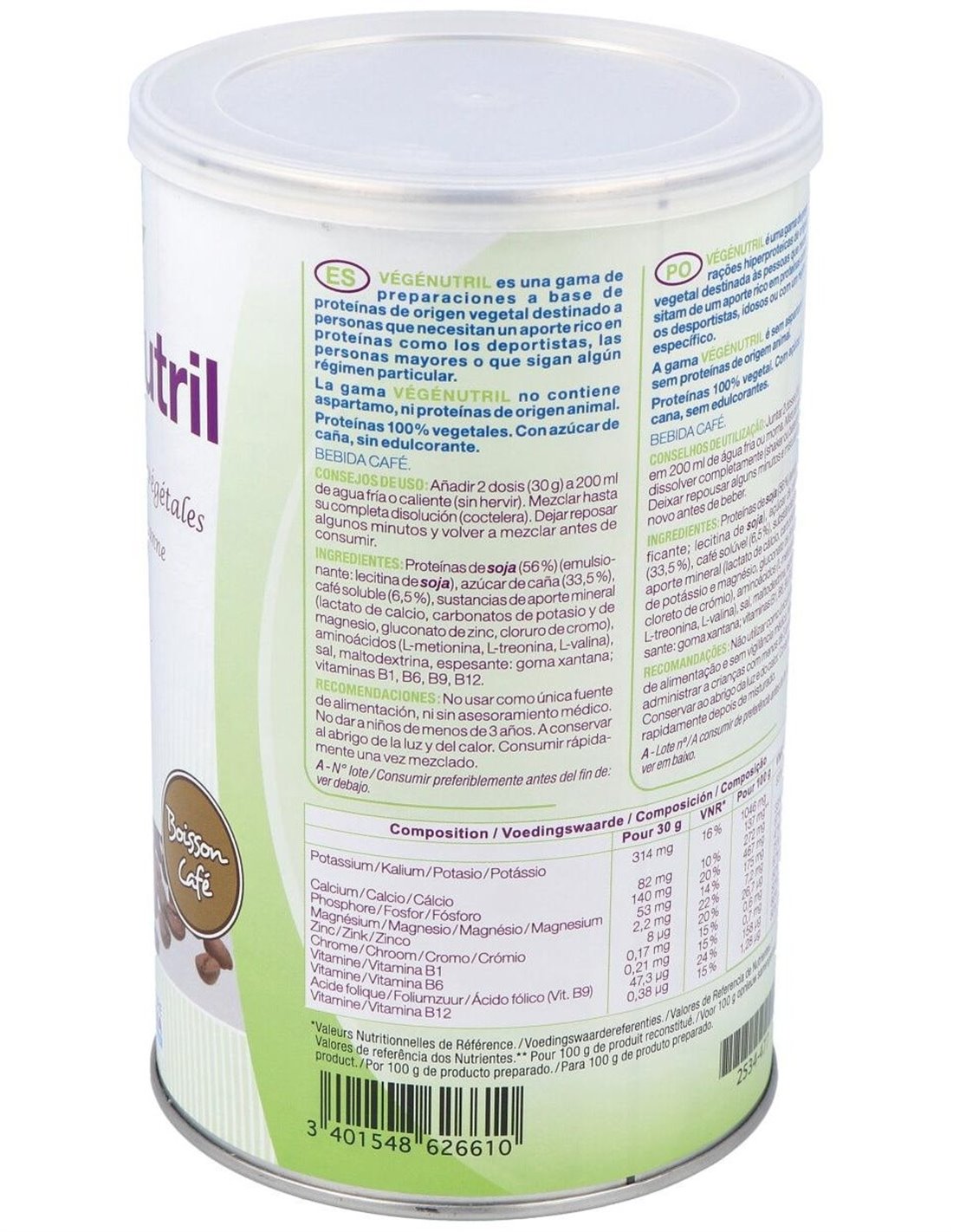 Proteínas de soja o guisante, azúcar de caña, lactato de calcio, carbonatos de potasio y magnesio, gluconato de zinc, yoduro de potasio, cloruro de cromo, metionina, treonina, valina, vitaminas B1, B6, B9, B12 (ver lista detallada en cada bote).