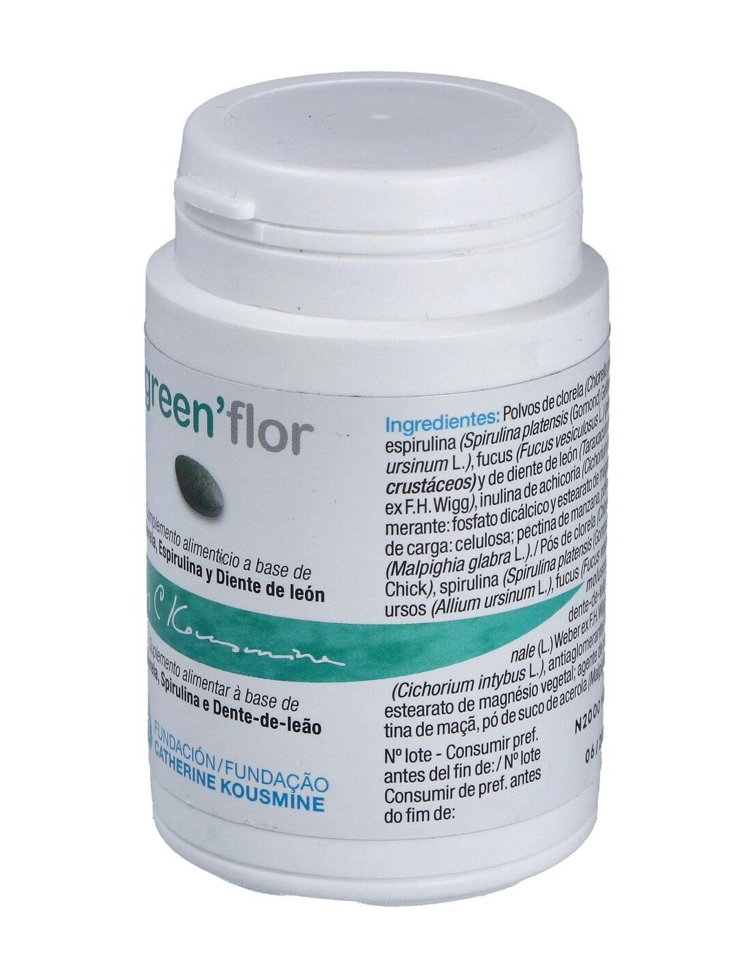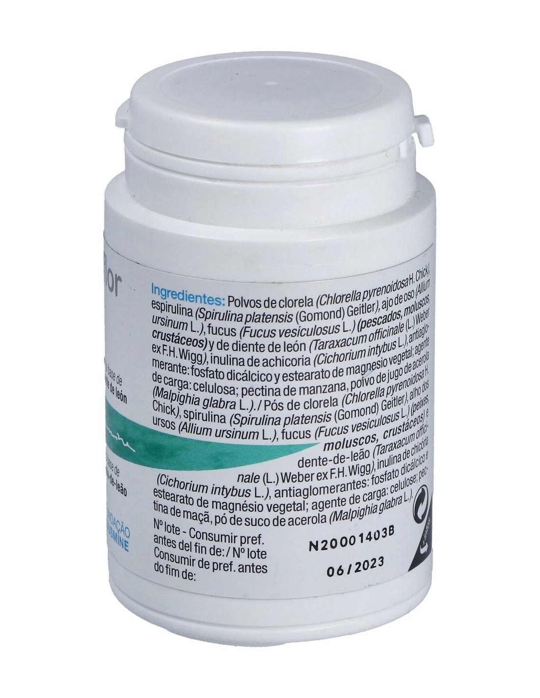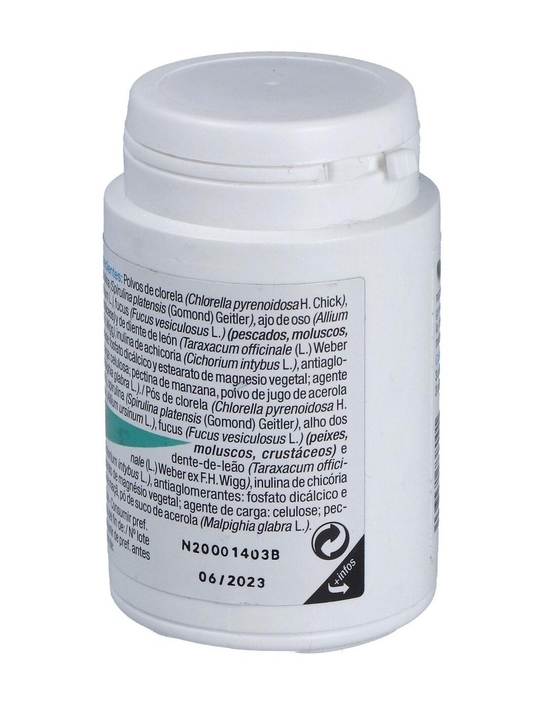 Inulina (FOS), chlorella, celulosa, espirulina, pectina de manzana, extracto de acerola, ajo, fucus, diente de león, estearato de magnesio, sílice.