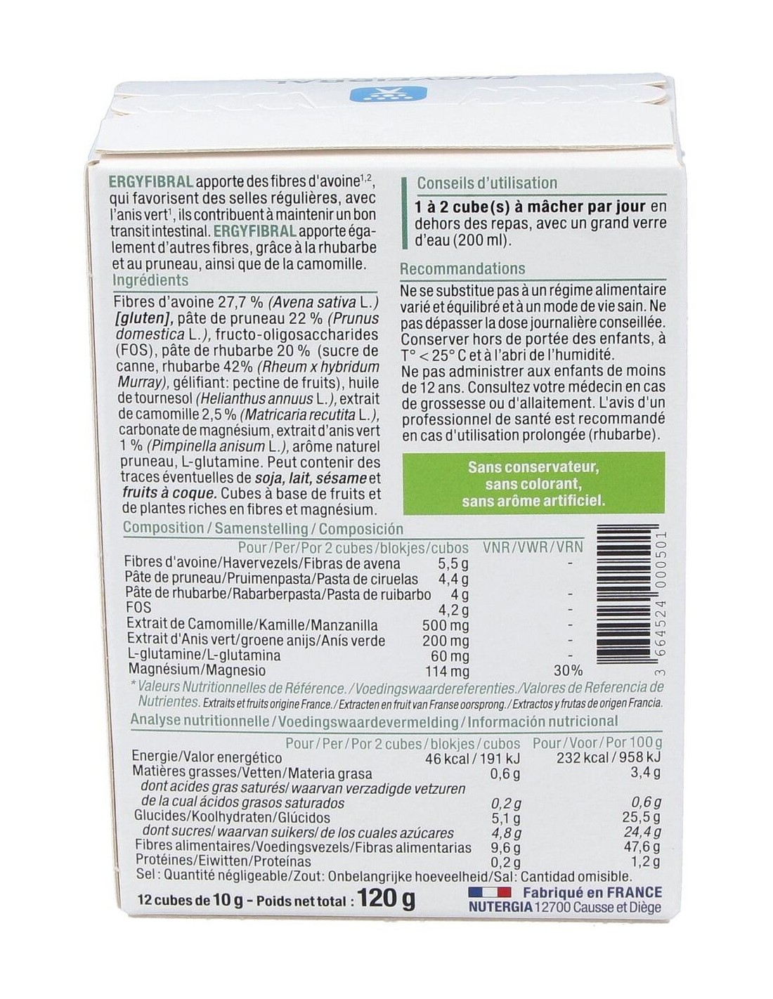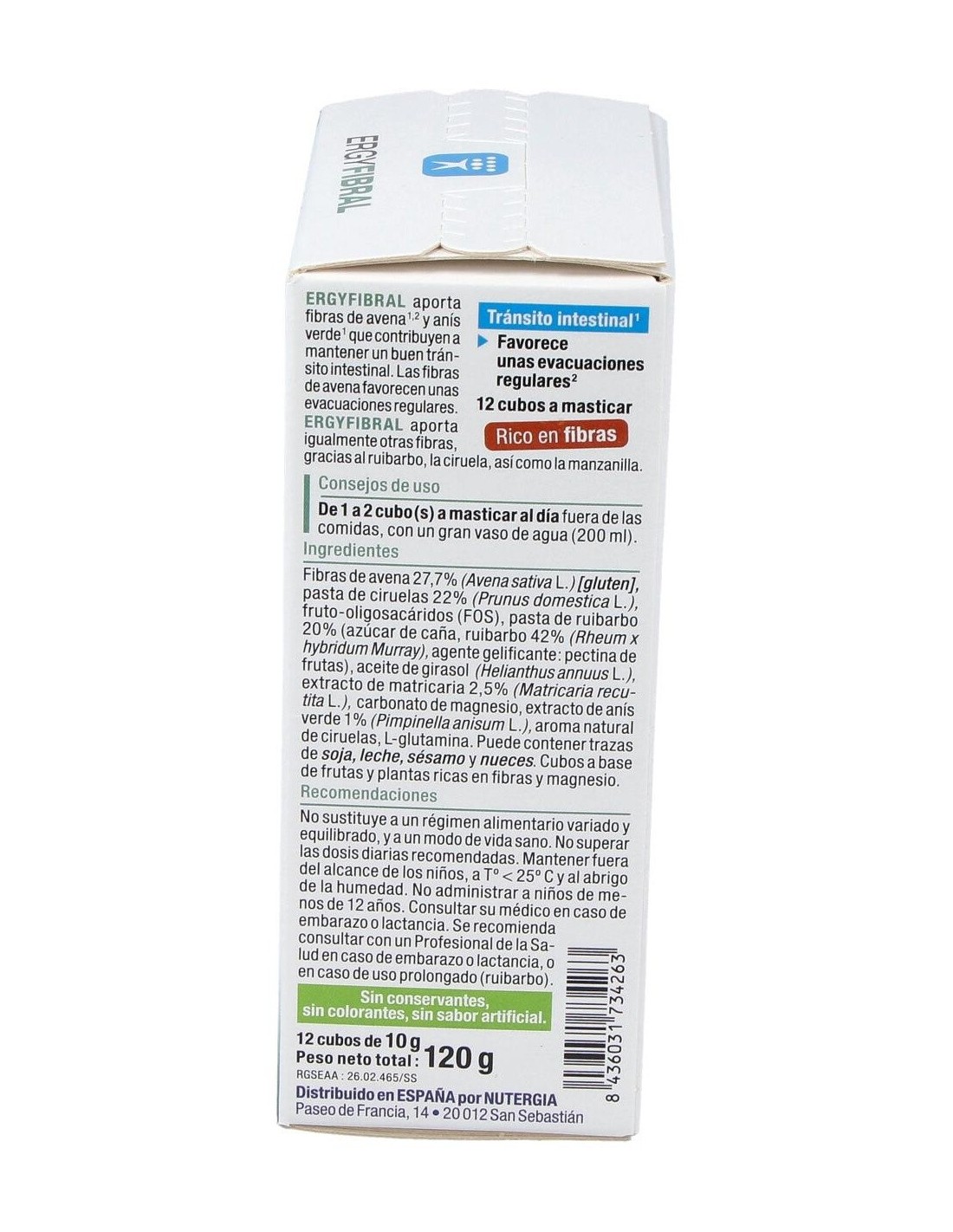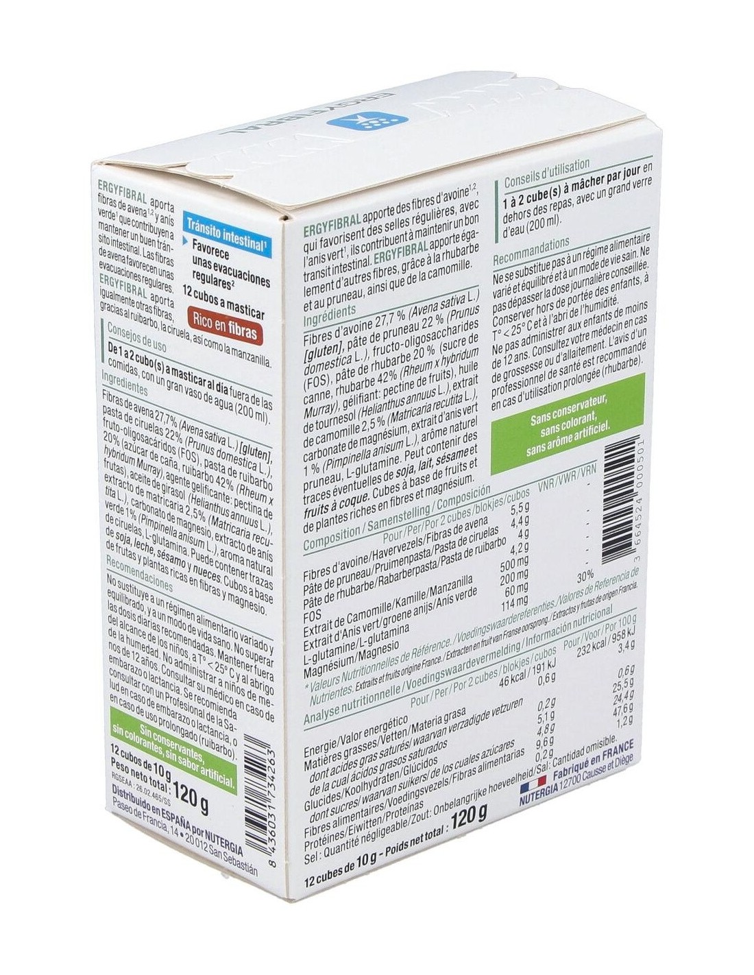 Fibras de avena 27,7 % (Avena sativa L.) [gluten], pasta de ciruelas 22 % (Prunus domestica L.), fructo-oligosacáridos (FOS), pasta de ruibarbo 20 % (azúcar de caña, ruibarbo 42 % (Rheum x hybridum Murray), agente gelificante: pectina de frutas), aceite de girasol (Helianthus annuus L.), extracto de manzanilla 2,5 % (Matricaria recutita L.), carbonato de magnesio, extracto de anís verde 1 % (Pimpinella anisum L.), aroma natural de ciruelas, L-glutamina.