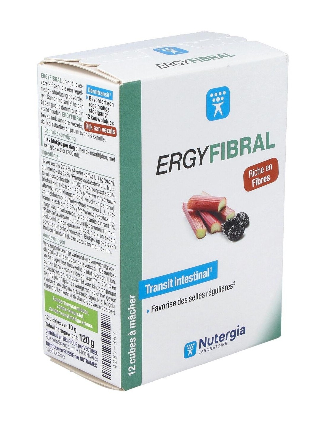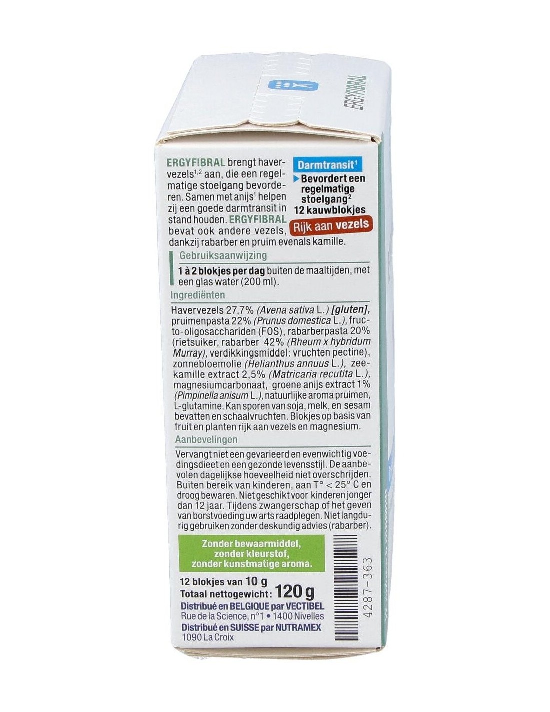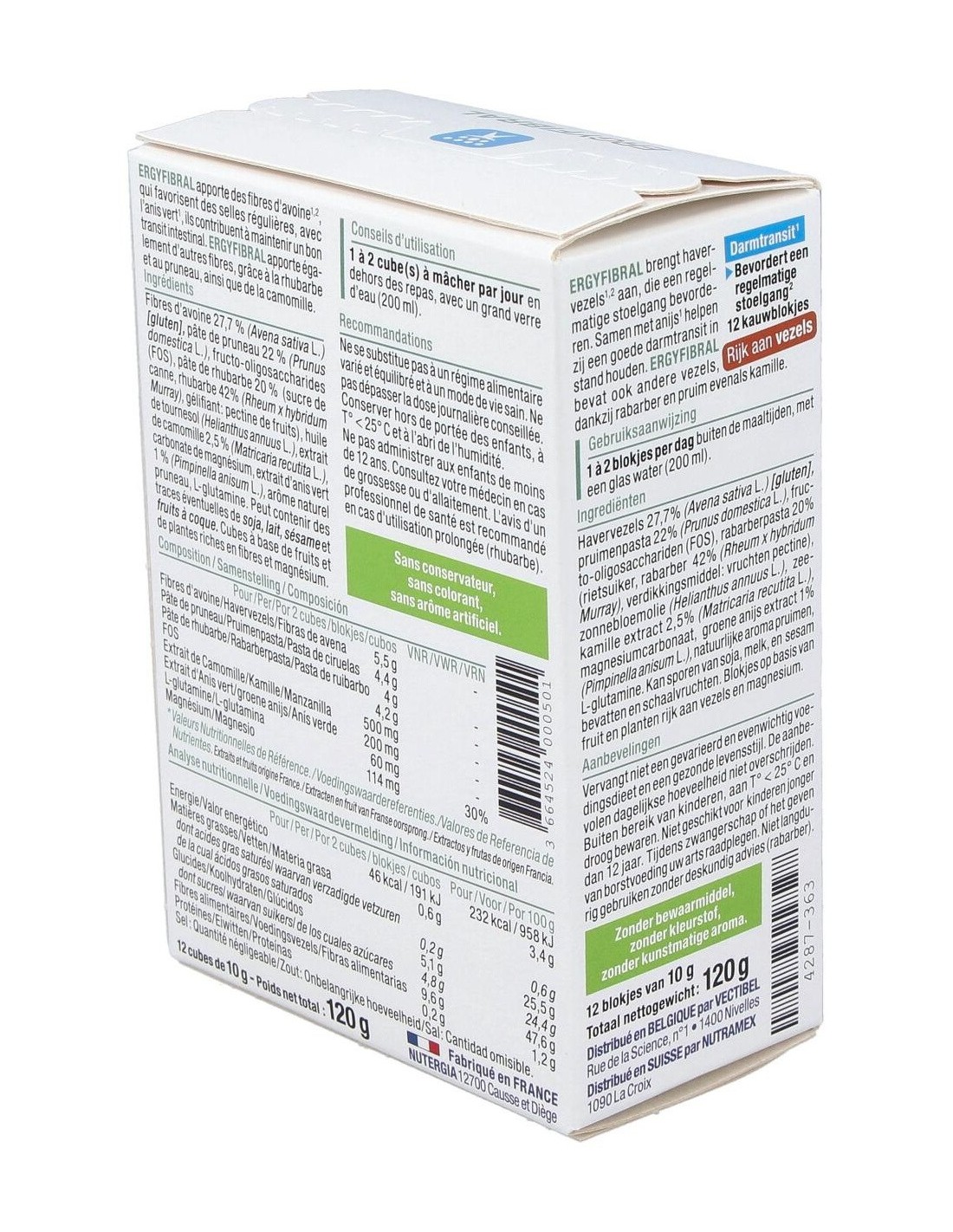 Fibras de avena 27,7 % (Avena sativa L.) [gluten], pasta de ciruelas 22 % (Prunus domestica L.), fructo-oligosacáridos (FOS), pasta de ruibarbo 20 % (azúcar de caña, ruibarbo 42 % (Rheum x hybridum Murray), agente gelificante: pectina de frutas), aceite de girasol (Helianthus annuus L.), extracto de manzanilla 2,5 % (Matricaria recutita L.), carbonato de magnesio, extracto de anís verde 1 % (Pimpinella anisum L.), aroma natural de ciruelas, L-glutamina.