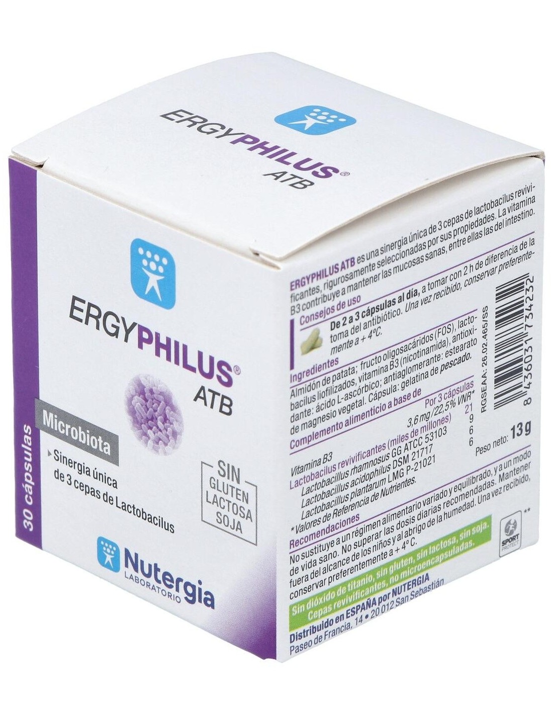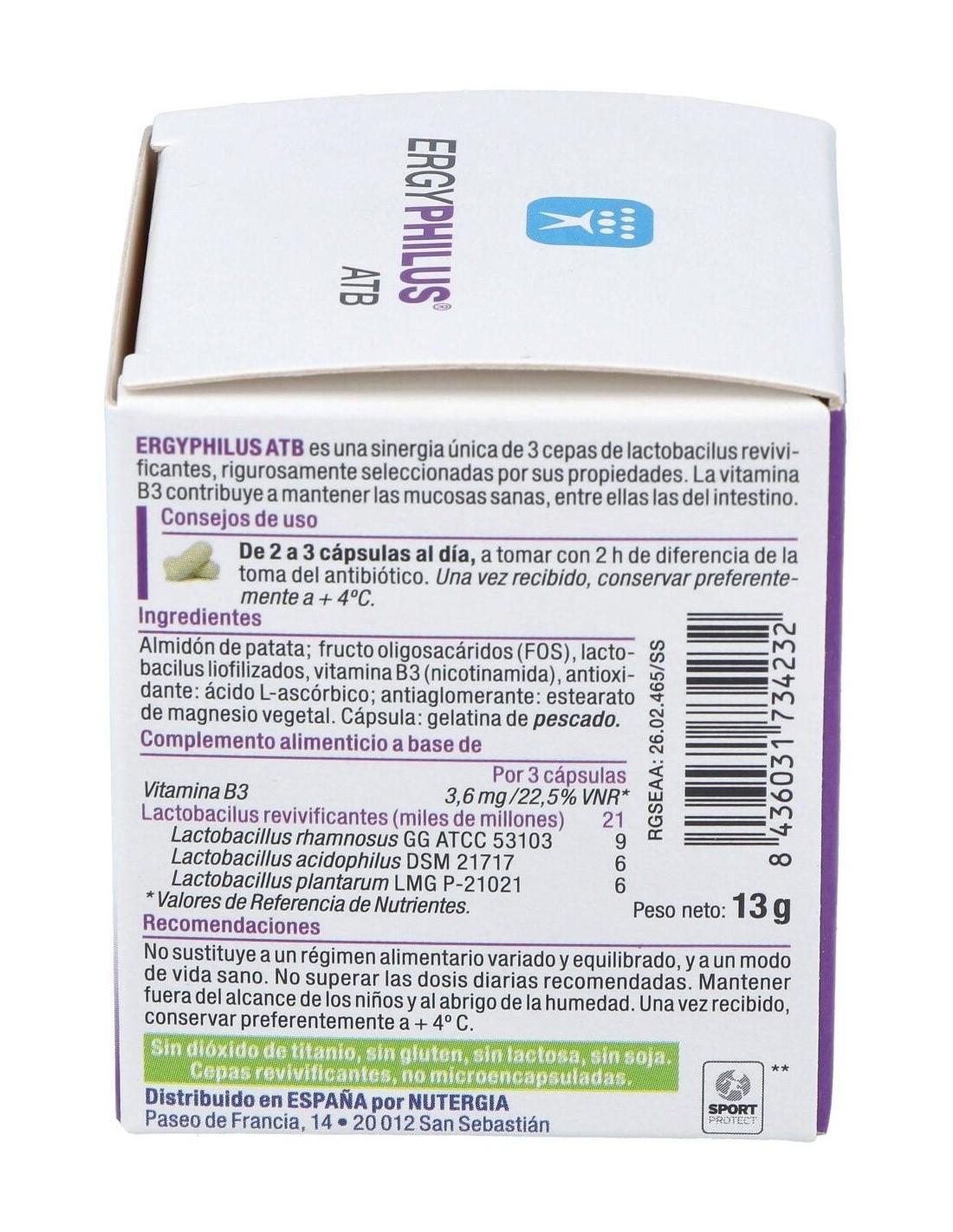 Almidón de patata, fructo oligosacáridos (FOS), lacto bacilos liofilizados, vitamina B3 (nicotinamida), antioxidante: ácido L-ascórbico: antiaglomerante: estearato de magnesio vegetal. Cápsula: gelatina de pescado.
