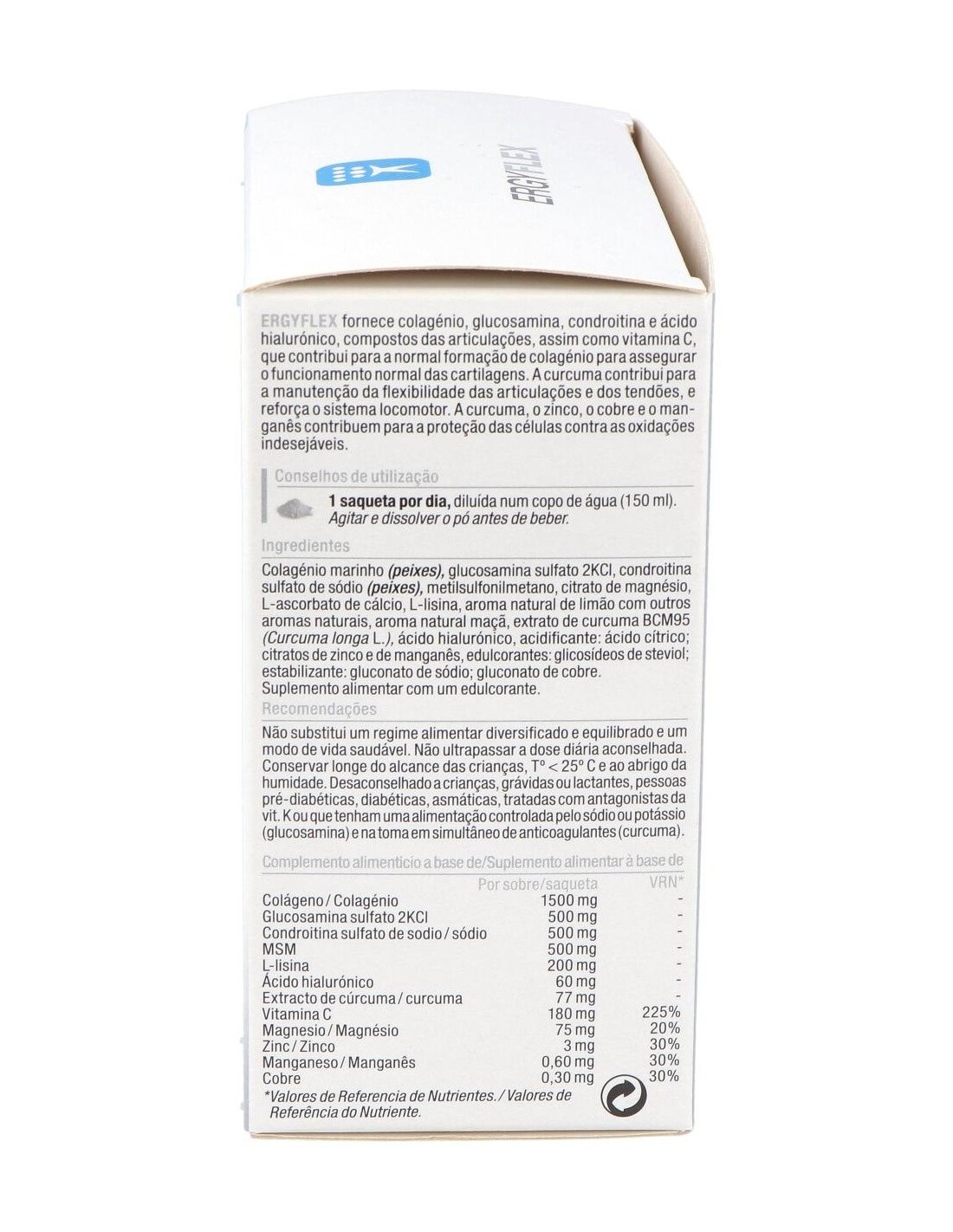 Colágeno marino hidrolizado (pescado), glucosamina sulfato 2KCl de origen vegetal, condroitina sulfato de sodio (pescado), metilsulfonilmetano, citrato de magnesio, L ascorbato de calcio, L-lisina, sabor natural de limón con otros sabores naturales, sabor natural de manzana, extracto de cúrcuma BCM-95® (Curcuma longa L.), ácido hialurónico, acidificante: ácido cítrico: citratos de zinc y de manganeso, edulcorante: glicósidos de steviol: estabilizante: gluconato de sodio: gluconato de cobre.