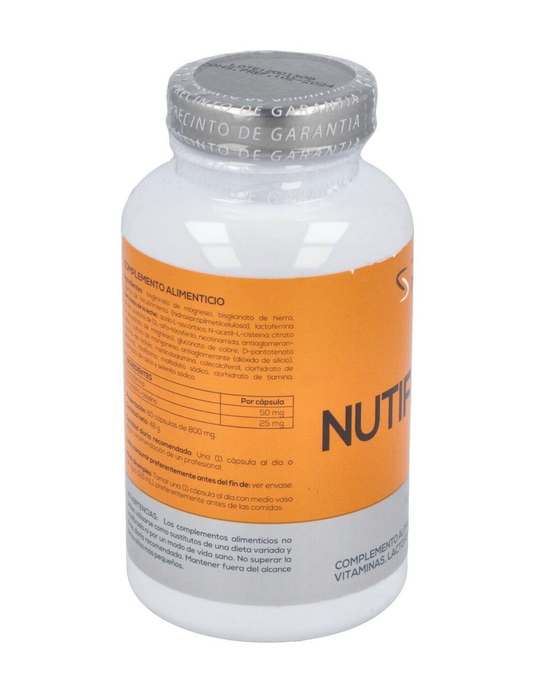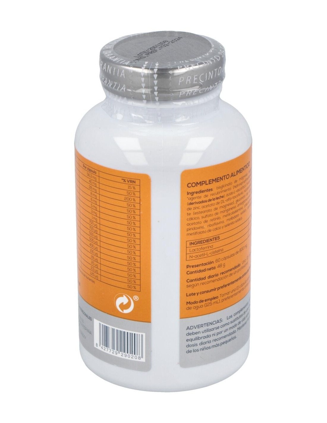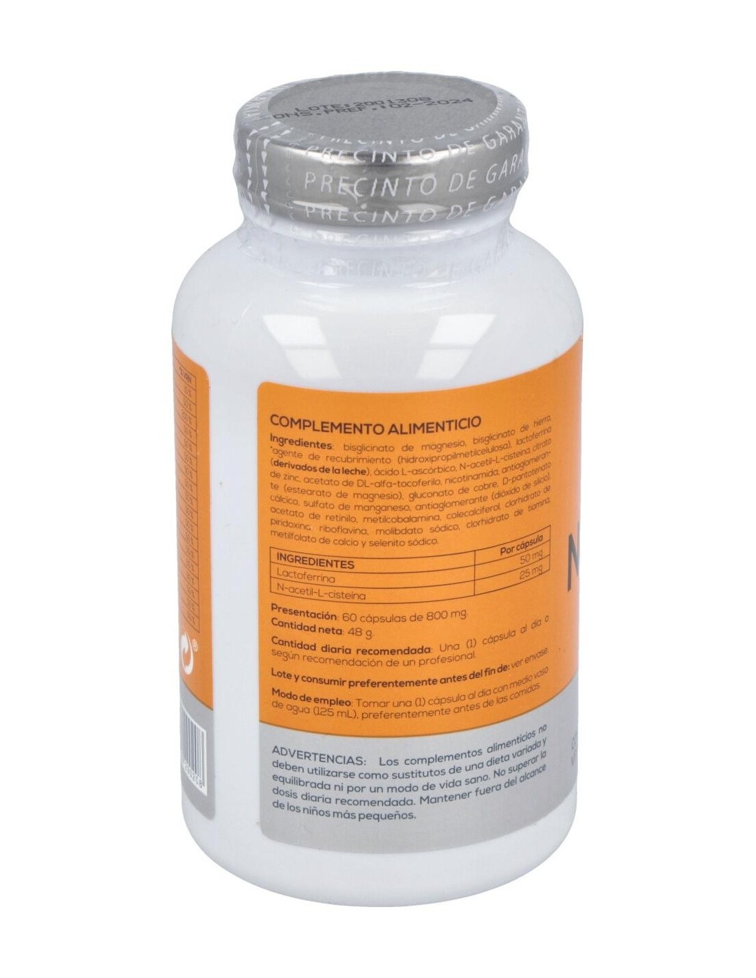 Complemento alimenticio en formato cápsula y elaborado a base de lactoferrina, N-acetil-L-cisteína, minerales y vitaminas. Con un gran aporte en hierro, está indicado para contribuir a la formación normal de los glóbulos rojos y la hemoglobina, y al transporte normal de oxígeno en el cuerpo.