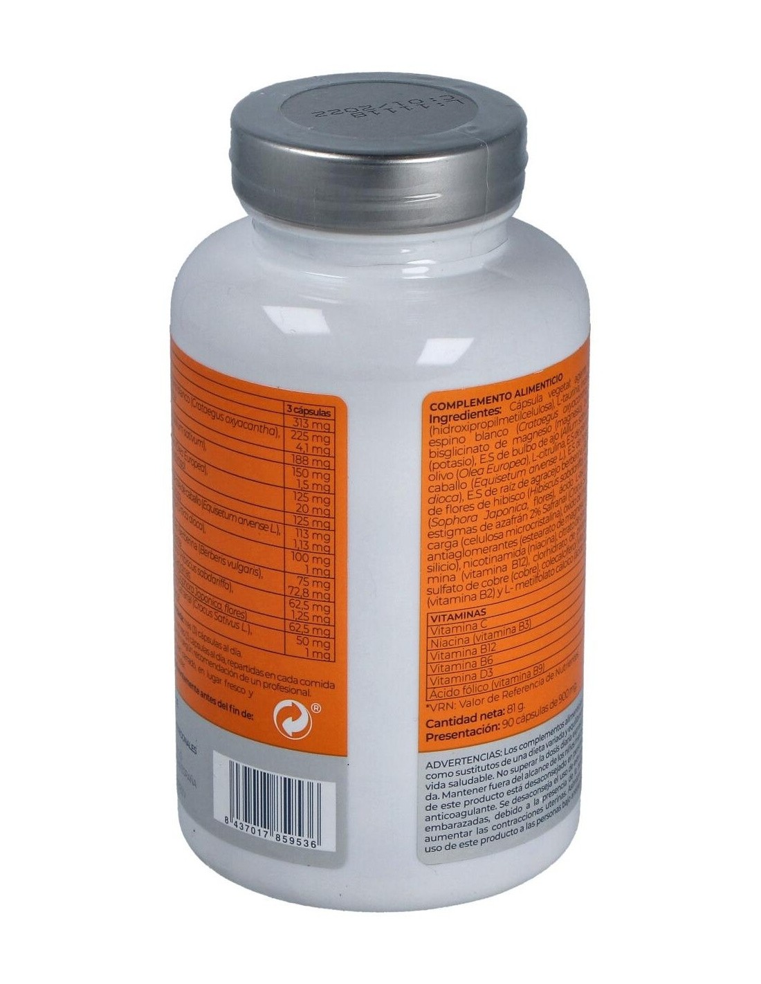 Cápsula vegetal: agente de recubrimiento (hidroxipropilmetilcelulosa), L-taurina, inosina, ext. seco de bayas de espino blanco (Crataegus oxyacantha), L-arginina base, bisglicinato de magnesio (magnesio), bicarbonato potásico (potasio), ext. seco de bulbo de ajo (Allium sativum), ext. seco del fruto de olivo (Olea Europea), L citrulina, ext. seco de planta entera de cola de caballo (Equisetum arvense L.), ext. seco de hojas de ortiga (Urtica dioca), ext. seco de raíz de agracejo berberina (Berberis vulgaris), ext. seco de flores de hibisco (Hibiscus sabdariffa), quercetina 98 % (UV) (Sophora Japonica, flores), ácido L-ascórbicom (vitamina C), estigmas de azafrán 2 % Safranal (Crocus Sativus L.), agente de carga (celulosa microcristalina), óxido de magnesio (magnesio), antiaglomerantes (estearato de magnesio vegetal y dióxido de silicio), nicotinamida (niacina), citrato de zinc (zinc), metilcobalamina (vitamina B12), clorhidrato de piridoxina (vitamina B6), sulfato de cobre (cobre), colecalciferol (vitamina D3), riboflavina (vitamina B2) y L-metilfolato cálcico (ácido fólico).