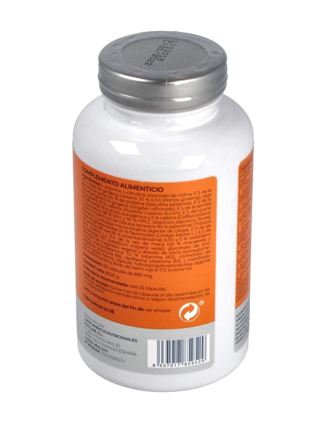 L-arginina, L-citrulina, bitartrato de colina, ext. seco de la raíz y hojas de ginseng coreano 30 % (UV) (Panax ginseng), alga spirulina en polvo 60 % de proteína (Spirulina platensis), ext. seco de la raíz de jengibre 5 % gingerol (Zingiber officinalis), ext. seco de la semilla de guaraná 22 % cafeína (Paullina cupana Kunth), ext. seco del grano de café verde 45 % ácido clorogénico y 5 % cafeína (Coffea arabica L.), quercetina 98 % (UV) y 95 % HPLC (Sophora japonica, flores), inosina, ext. seco del fruto de tribulus terrestris 90 % saponinas (Tribulus terrestris L.), celulosa microcristalina (agente de carga), ext. seco de las hojas de ginkgo biloba 24 % flavonoides (Ginkgo biloba L.), ext. seco de las semillas de uva 95 % proantocianidinas (UV) y 5 % resveratrol (Vitis vinífera L.), ext. seco de la raíz de maca 0,6% macaenos y macamidas 10:1 (Lepidium meyenii walp), gluconato de zinc, estearato de magnesio vegetal y dióxido de silicio (antiaglomerantes), metilcobalamina 0,1 % (vitamina B12), clorhidrato de piridoxina (vitamina B6), riboflavina (vitamina B2), L-metilfolato cálcico (ácido fólico), cápsula: hidroxipropilmetilcelulosa (agente de recubrimiento) y óxido de hierro rojo E-172 (colorante).