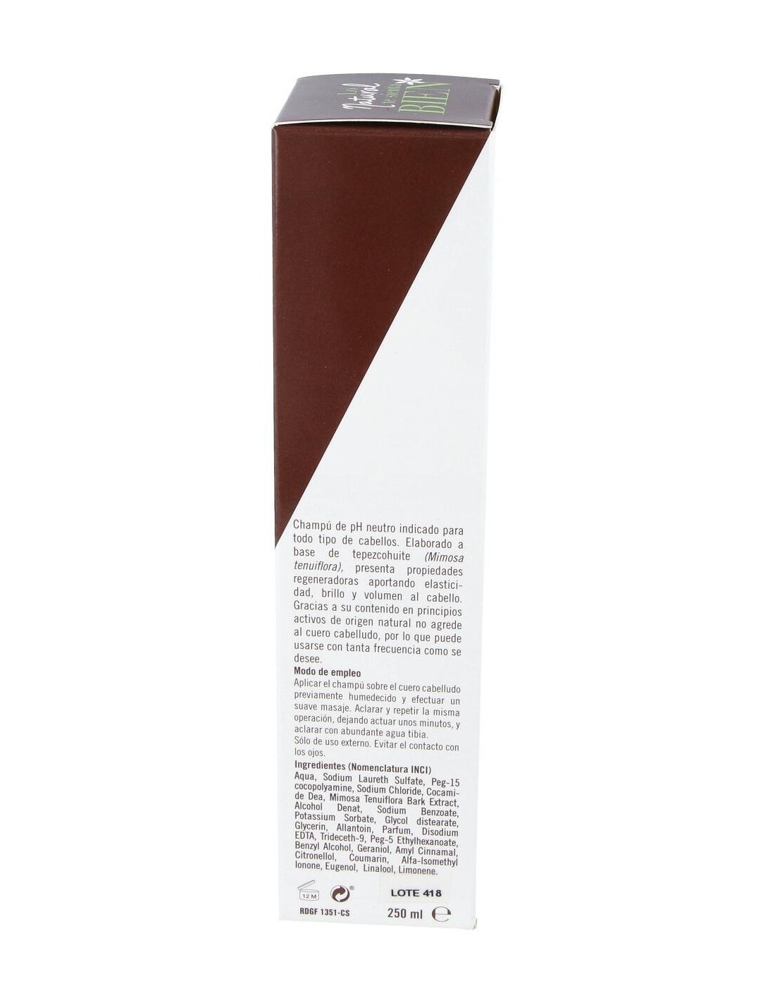 Champú de pH neutro indicado para todo tipo de cabellos. Elaborado a base de tepezcohuite (Mimosa tenuiflora), presenta propiedades regeneradoras aportando elasticidad, brillo y volumen al cabello. Gracias a su contenido en principios activos de origen totalmente natural no agrede el cuero cabelludo, por lo que puede usarse con tanta frecuencia como se desee.