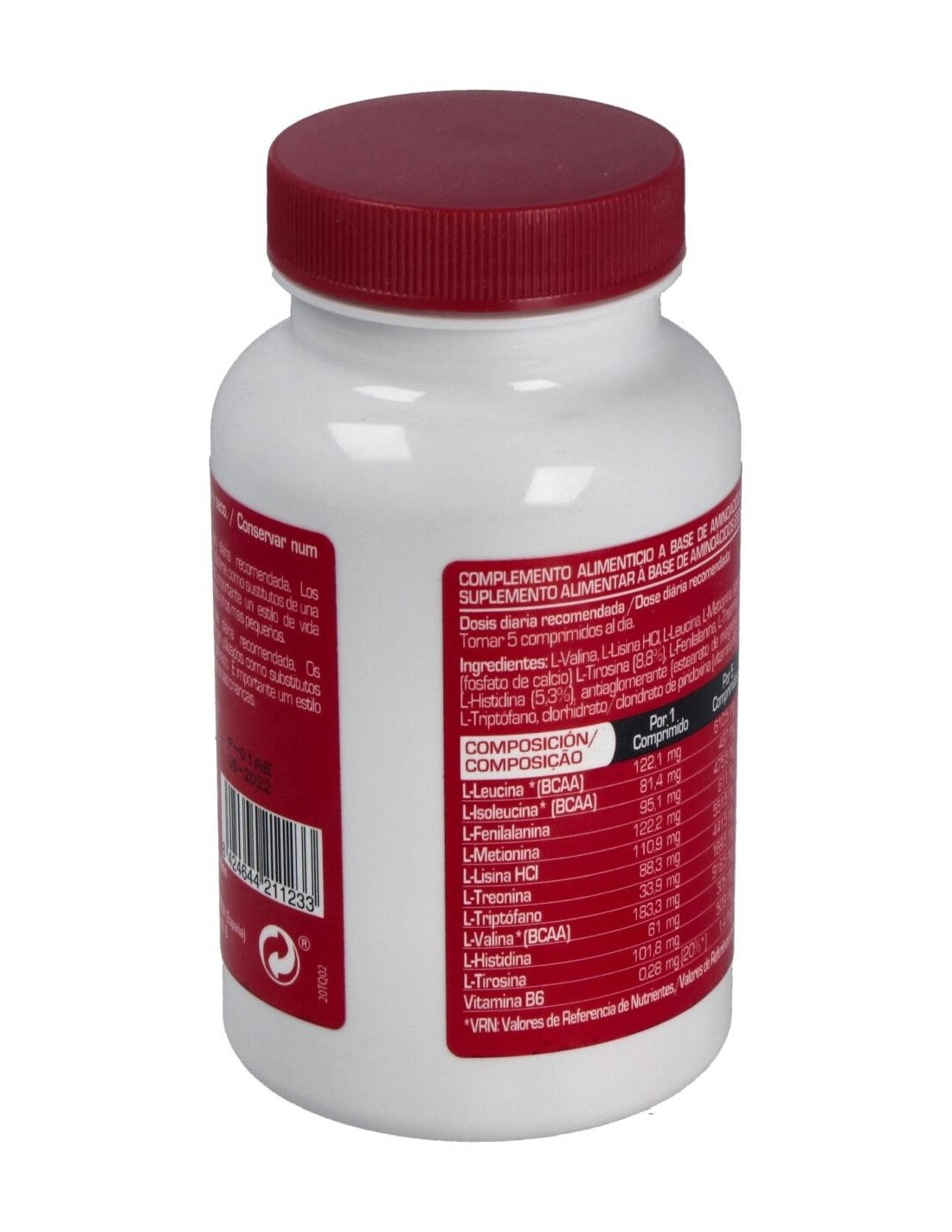 L-Leucina, L-Metionina, L-Valina, L-Lisina, L-Tirosina (8,8%), L-Fenilalanina, L-Treonina, L-Isoleucina, L-Histadina (5,3%), L-Triptófano, Agente de Carga (Fosfato Cálcico), Lubricante (Estearato de Magnesio Vegetal), Piridoxina Clorhidrato.