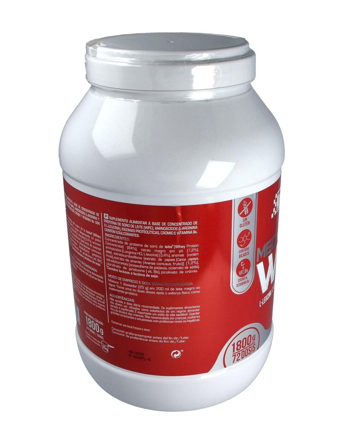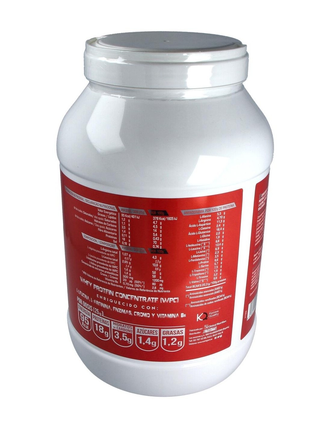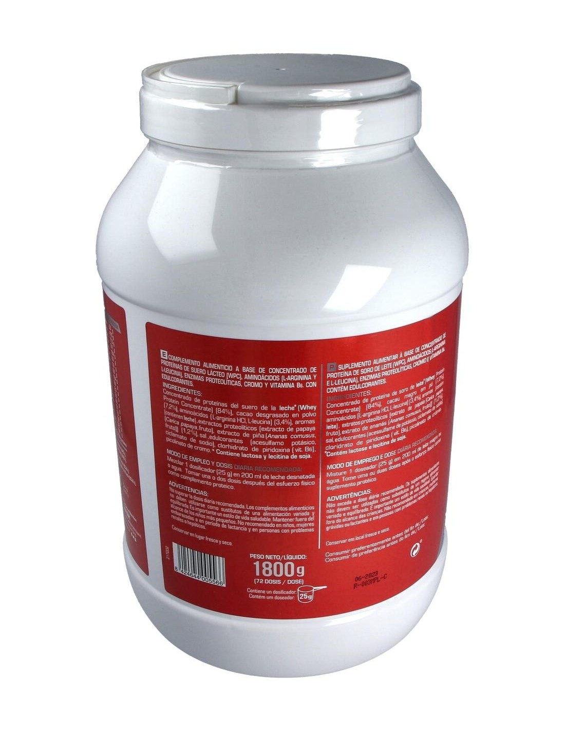 Concentrado de proteína de suero de leche (86%), oligosacaridos, aminoácidos (L-arginina, L-leucina)(3,4%), aromas, extractos proteolíticos (extracto de papaya (carica papaya, fruto), extracto de piña (ananas comusus, fruto)) (1,2%), cloruro sódico, espesante (goma xantana), edulcorantes (acesulfame de potasio, sucralosa) colorante (E-102), vitamina B6 (clorhidrato de piridoxina)(0,004%), picolinato de cromo (0,001%).