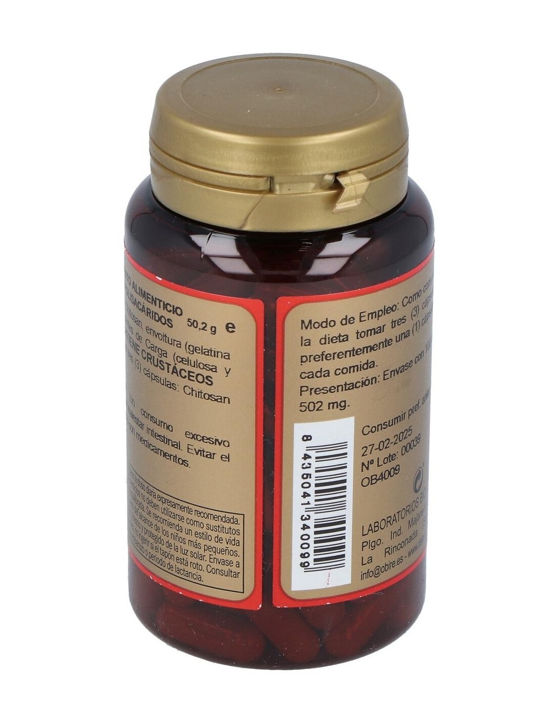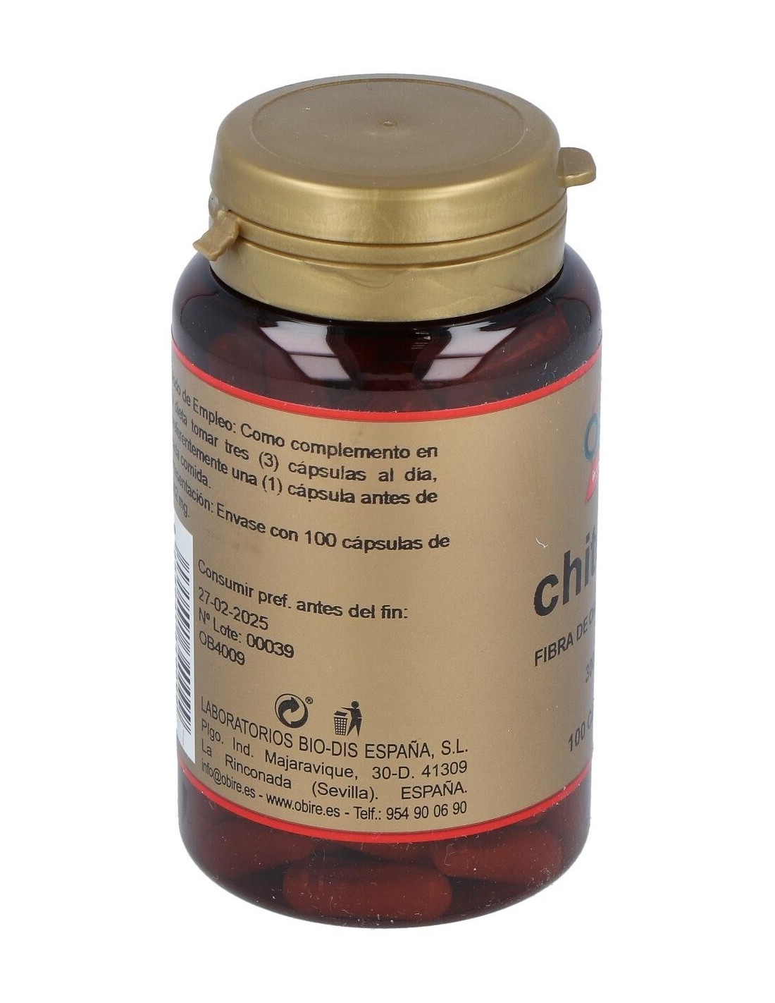 Obire Chitosan es un complemento alimenticio indicado para favorecer la pérdida de peso, de una forma totalmente segura y controlada. El chitosán es un producto derivado de la chitita, extraído del caparazón de los crustáceos, que logra absorber toda la grasa ingerida y expulsarla junto con la fibra. Te proporcionara un efecto saciante impidiendo que ingieras una cantidad excesiva de alimento en cada comida y, especialmente, que no piques entre horas. Notarás como tu peso disminuye, tu masa corporal se reduce y tú te sientes más reconfortada.