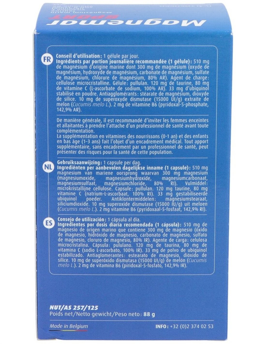 Por 1 cápsula: 300 mg de Magnesio marino completo al 58,8%, conteniendo 177 mg de Magnesio elemento. 120 mg de Taurina (Ácido 2-amino-etano-sulfónico). 80 mg de Vitamina C (L-Ascorbato sódico natural). 33 mg de Ubiquinol en polvo ( Kaneka QH ® estabilizado). 10 mg de Superoxido de Dismutasa (SOD B®) 15.000 UI/gr (extraído del melón Curcumis melo L.) equivalentes a 150 UI SOD/día, es biodisponible en el duodeno gracias a estar micro encapsulado con un recubrimiento vegetal patentado. 2 mg de Vitamina B6 (Clorhidrato de piridoxina).