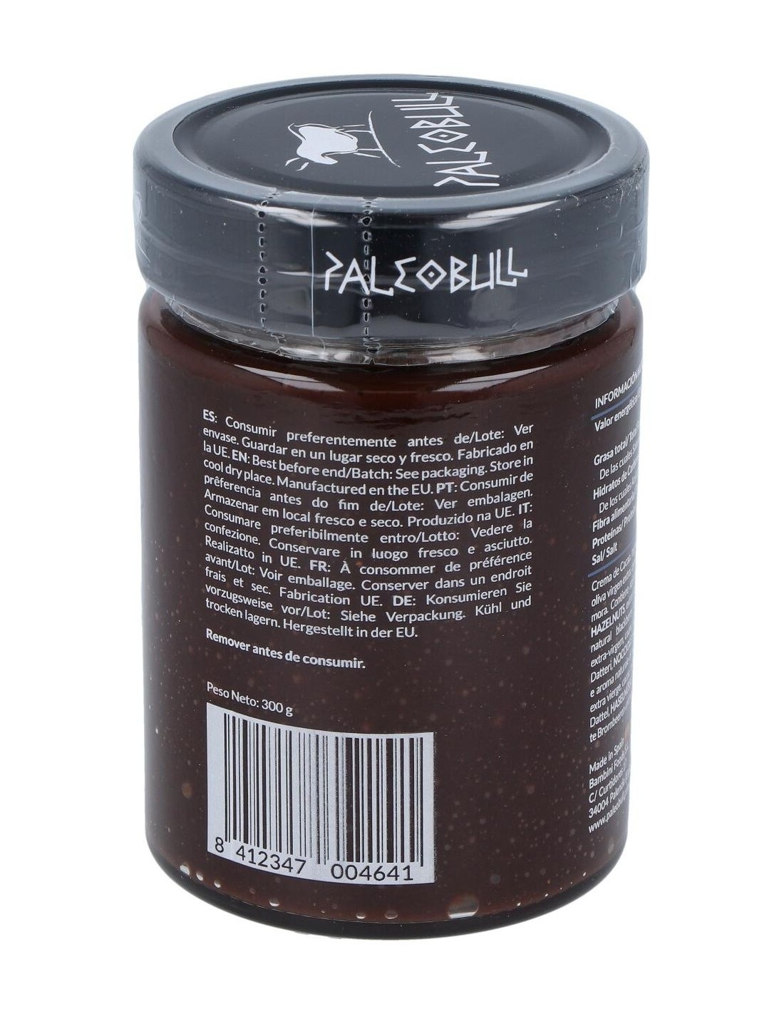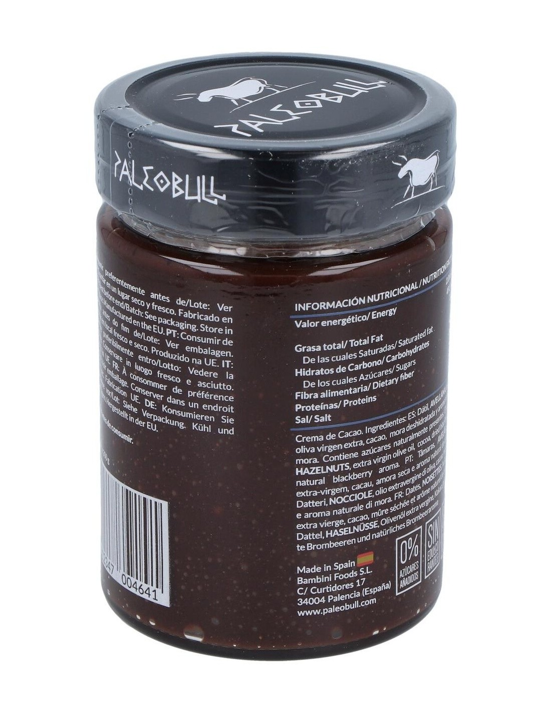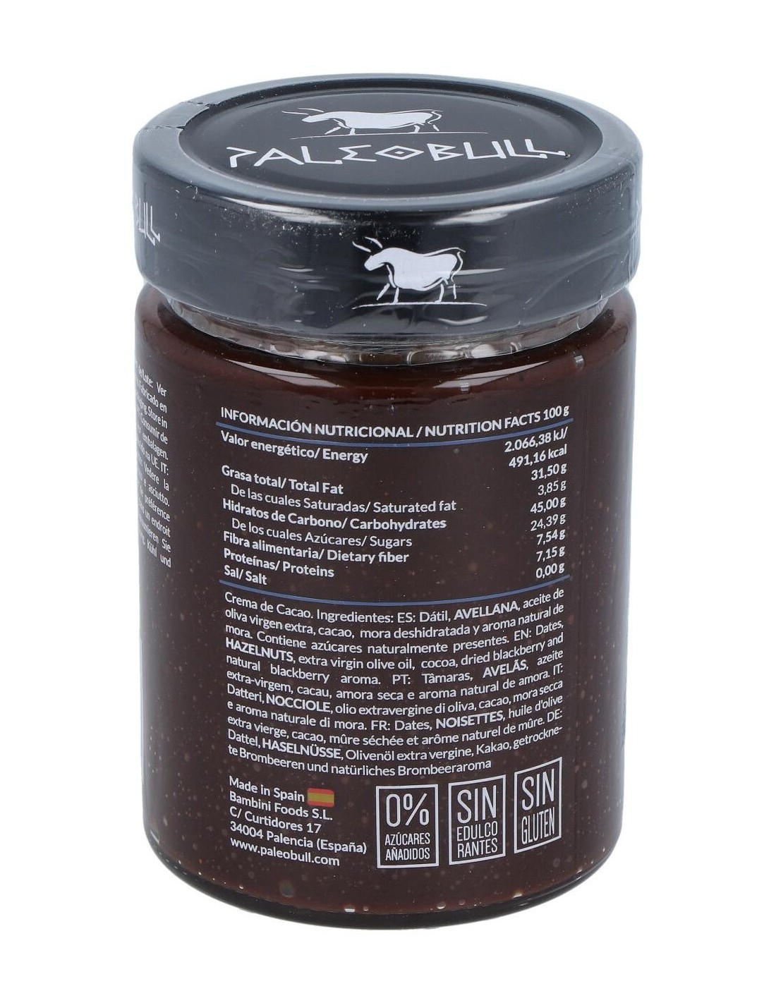 PALEOBULLCrema de cacao y avellanas saludable, elaborada con dátiles, cacao, avellanas, aceite de oliva virgen extra (AOVE) y mora. Sin azúcares añadidos y sin edulcorantes.