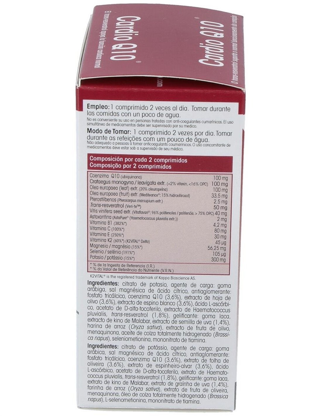 Compuesto constituido por una combinación sinérgica de plantas (fito-nutrientes, entre ellos la pepita de uva, espino blanco, resveratrol y vitamina B1, sustancias que apoyan la función cardíaca. El potasio y el extracto de hoja de olivo (a 20% de oleuropeína) contribuyen a mantener una tensión arterial normal. La vitamina K, bajo la forma de MK-7 de doble protección y encapsulada (K2VITAL® Delta), juega un papel en el proceso de coagulación sanguínea. El magnesio participa en la función muscular, y por ello en las contracciones del músculo cardíaco. La vitamina E y el selenio, intervienen en la protección de las células contra el estrés oxidativo, al igual que la vitamina C, que apoya también la formación del colágeno para asegurar el mantenimiento del buen funcionamiento de los vasos sanguíneos.