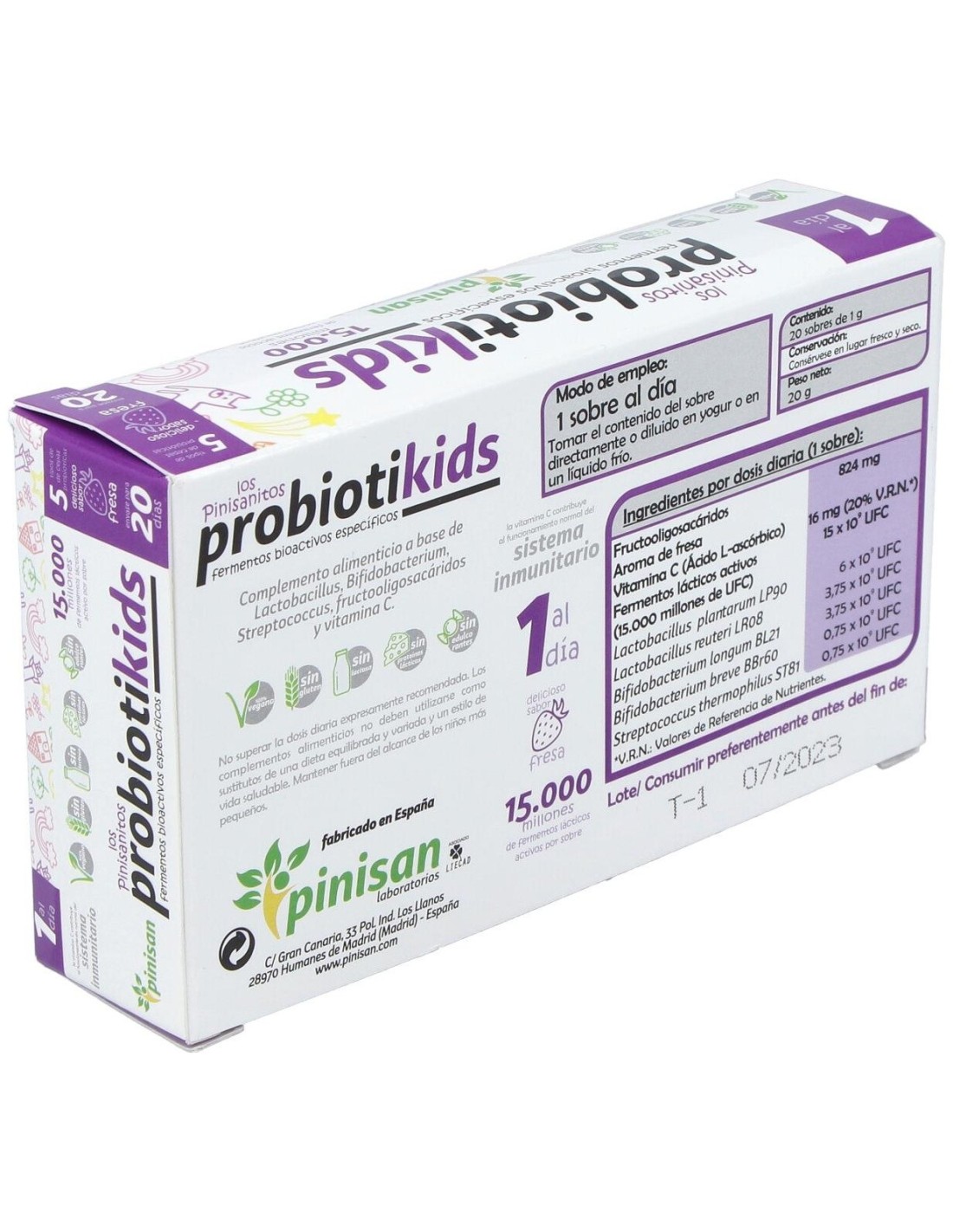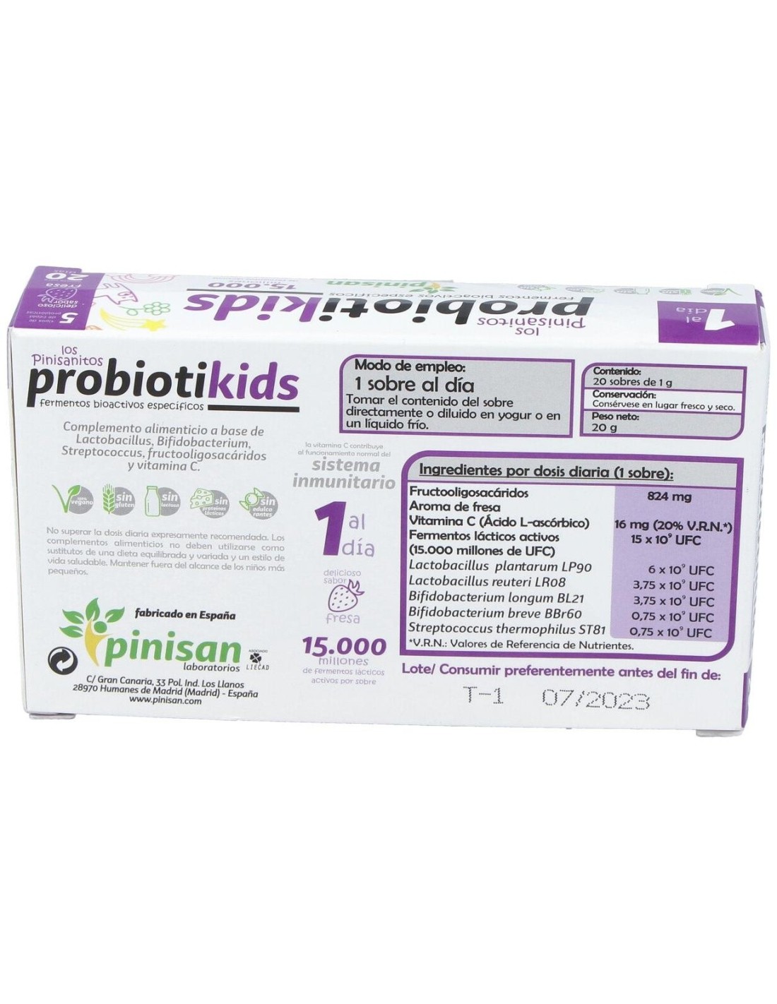 Contiene un cañón probiótico de bacterias vivas con una alta actividad garantizada, FOS (fructooligosacáridos) de alta solubilidad y vitamina C que contribuyen al normal mantenimiento del sistema inmune y digestivo. Con sabor a fresa. Producto vegano.