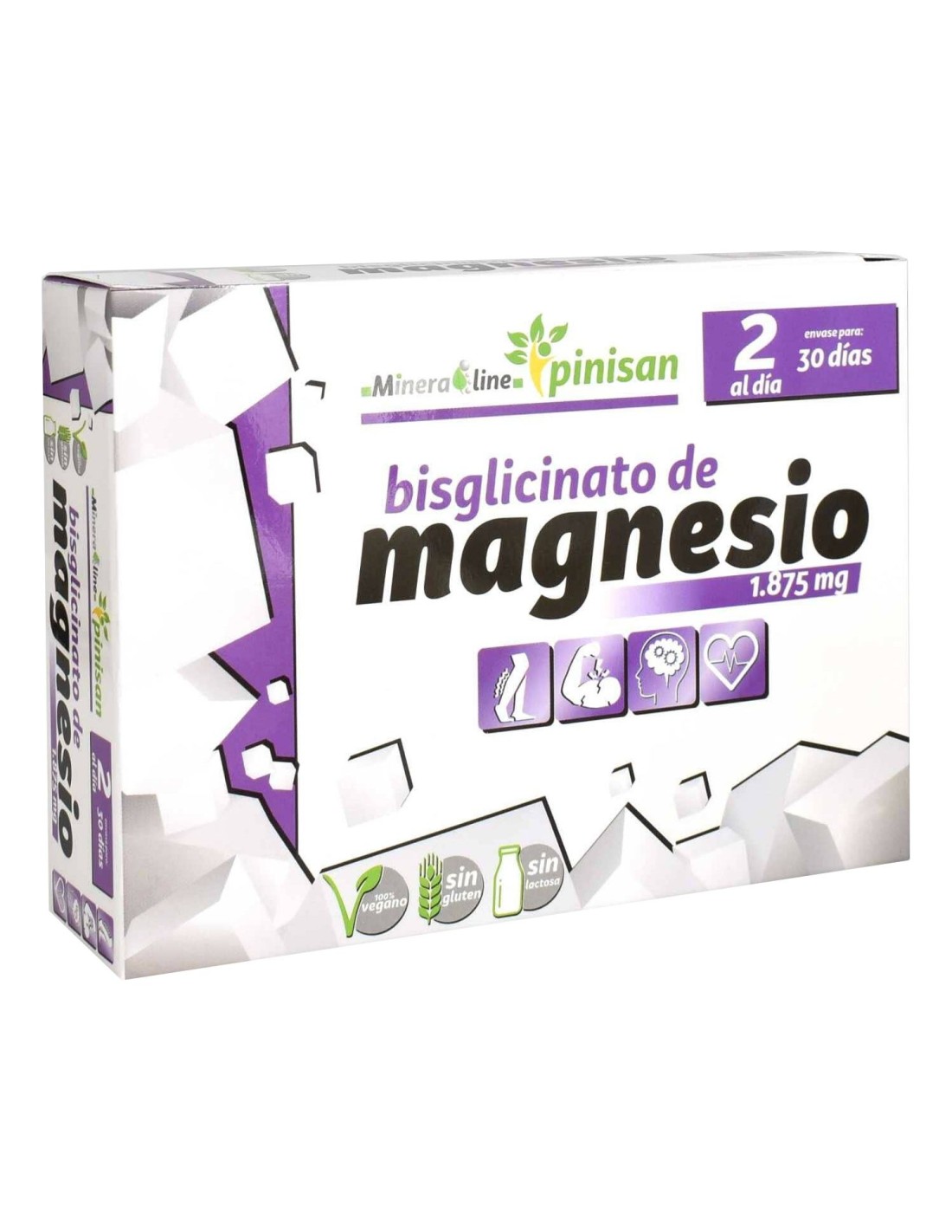 PINISANComplemento alimenticio a base de magnesio. El magnesio ayuda a disminuir el cansancio y la fatiga. Contribuye al equilibrio electrolítico, al metabolismo energético normal y al normal funcionamiento del sistema nervioso y los músculos, así como al mantenimiento de los huesos y dientes en condiciones normales. El Bisglicinato de Magnesio es un compuesto orgánico de magnesio basado en la combinación de un átomo de magnesio y dos moléculas del aminoácido glicina, lo que da como resultado un compuesto orgánico que mejora la absorción y biodisponibilidad del magnesio en el organismo. Producto 100% vegano, sin gluten ni lactosa.