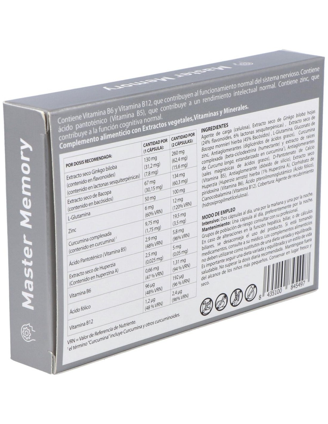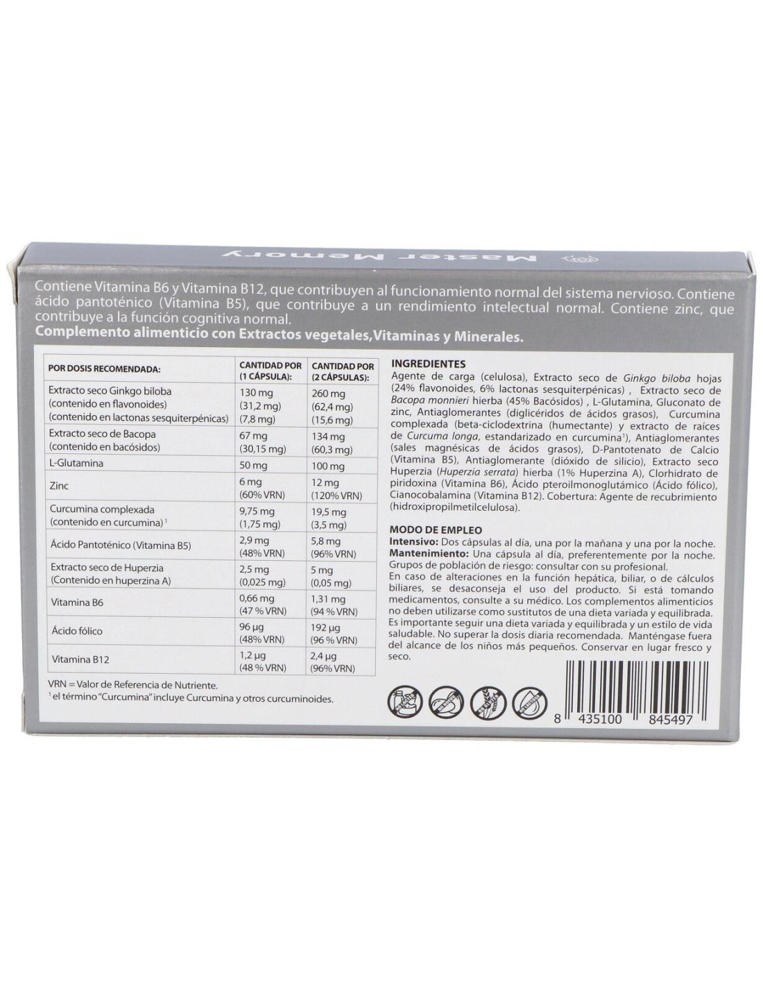Agente de carga (celulosa), Extracto seco de Ginkgo biloba hojas (24% flavonoides, 6% lactonas sesquiterpénicas), Extracto seco de Bacopa monnieri hierba (45% Bacósidos), L-Glutamina, Gluconato de zinc, Antiaglomerantes (diglicéridos de ácidos grasos), Curcumina complexada (beta-ciclodextrina (humectante) y extracto de raíces de Curcuma longa, estandarizado en curcumina*), Antiaglomerantes (sales magnésicas de ácidos grasos), D-Pantotenato de Calcio (vitamina B5), Antiaglomerante (dióxido de Silicio), Extracto seco Huperzia (Huperzia serrata) hierba (1% huperzina A), Clorhidrato de piridoxina (vitamina B6), Ácido pteroilmonoglutámico (ácido fólico), Cianocobalamina (vitamina B12). Cobertura: Agente de recubrimiento (hidroxipropilmetilcelulosa).