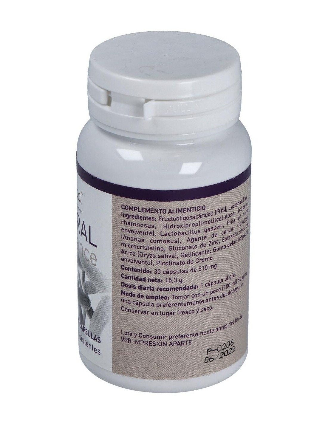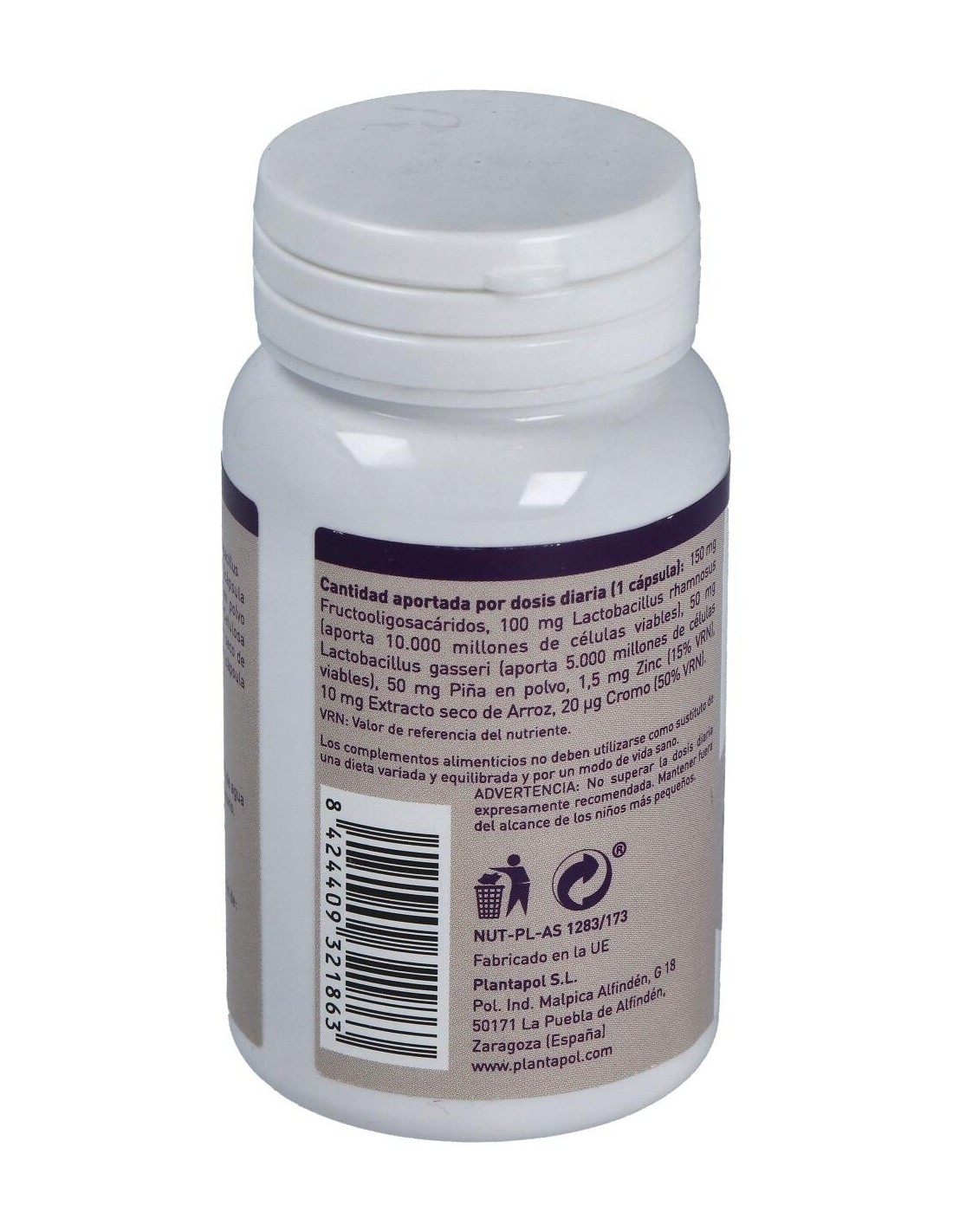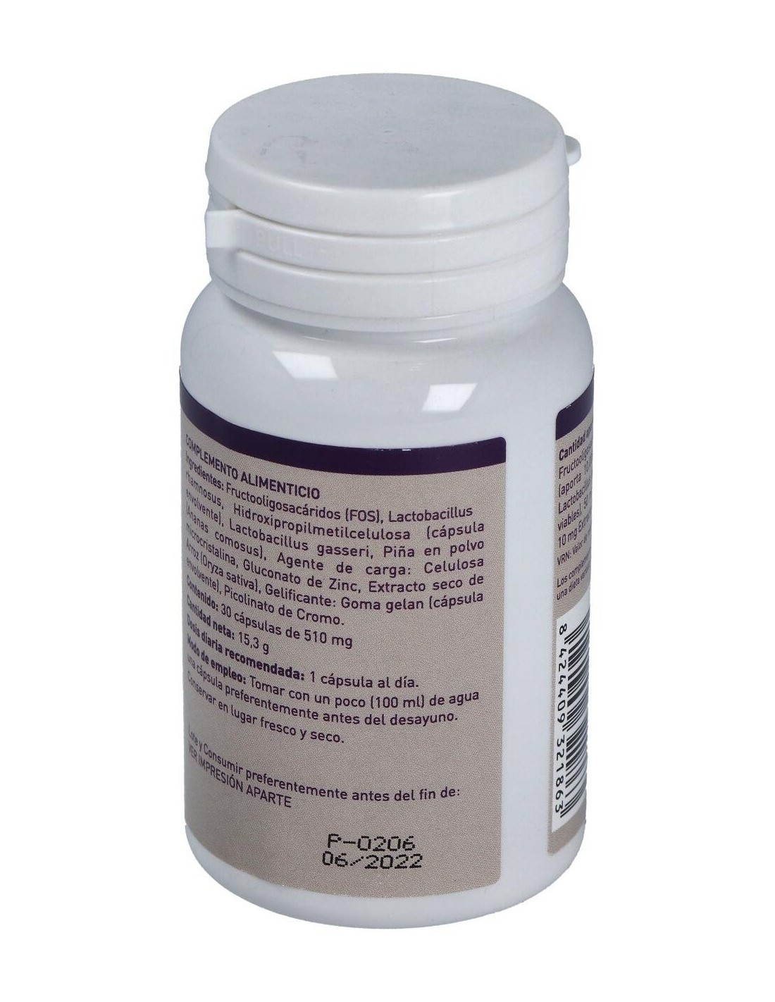 Fructooligosacáridos (FOS), Lactobacillus Rhamnosus, Lactobacillus Gasseri, Oryza sativa, Ananas comosus, Gluconato de Zinc, Picolinato de Cromo., Agente de carga: Celulosa microcristalina, Cápsula envolvente:, Hidroxipropilmetilcelulosa, Gelificante: Goma gelan.