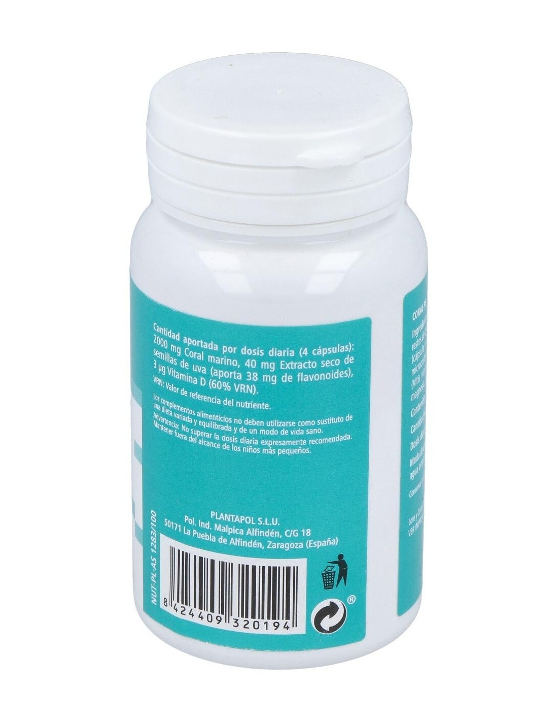 Coral marino, extracto de semilla de Uva, Vit D3. Antiaglomerante: estearato del magnesio Gelatina: cápsula vacía.