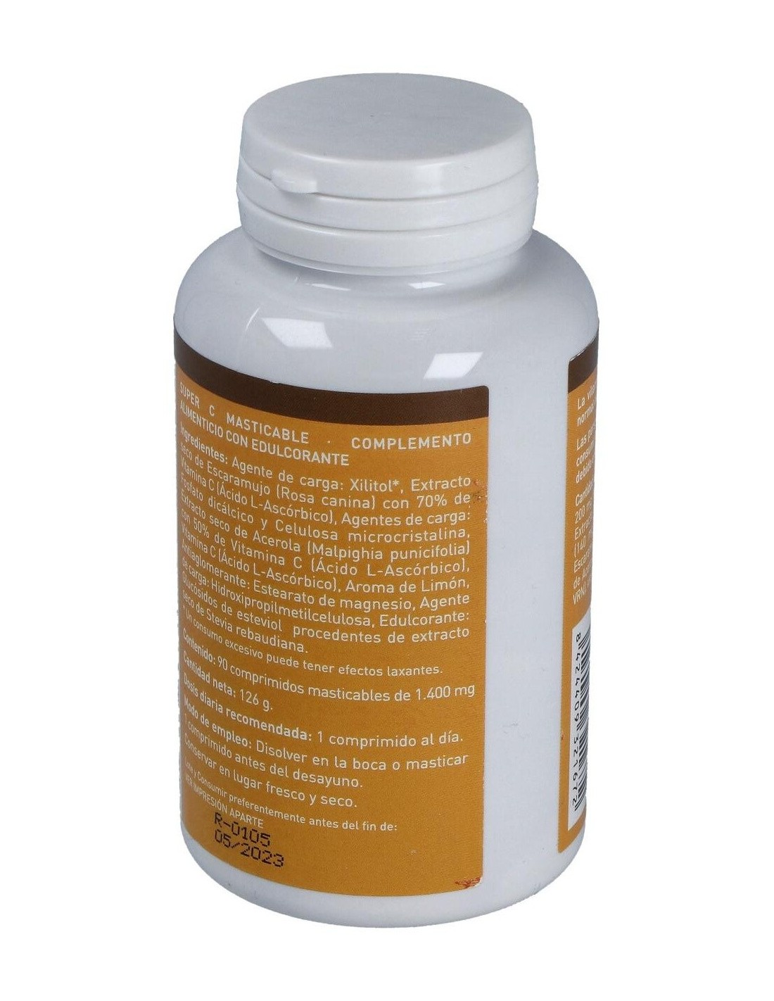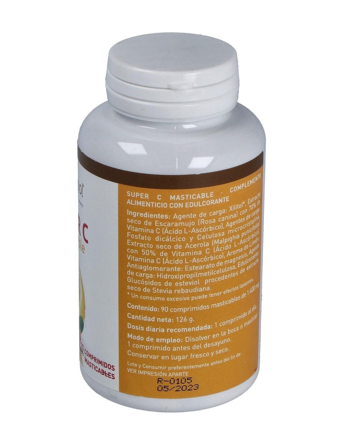 Rosa canina, Malpighia punicifolia, Ácido L-ascórbico, Agentes de carga: Xilitol, celulosa microcristalina, fosfato dicálcico, hidroxipropilmetilcelulosa, Antiaglomerantes: Estearato de magnesio, Edulcorante: Glucósidos de esteviol procedente de extracto seco de Stevia rebaudiana, Aroma de limón.