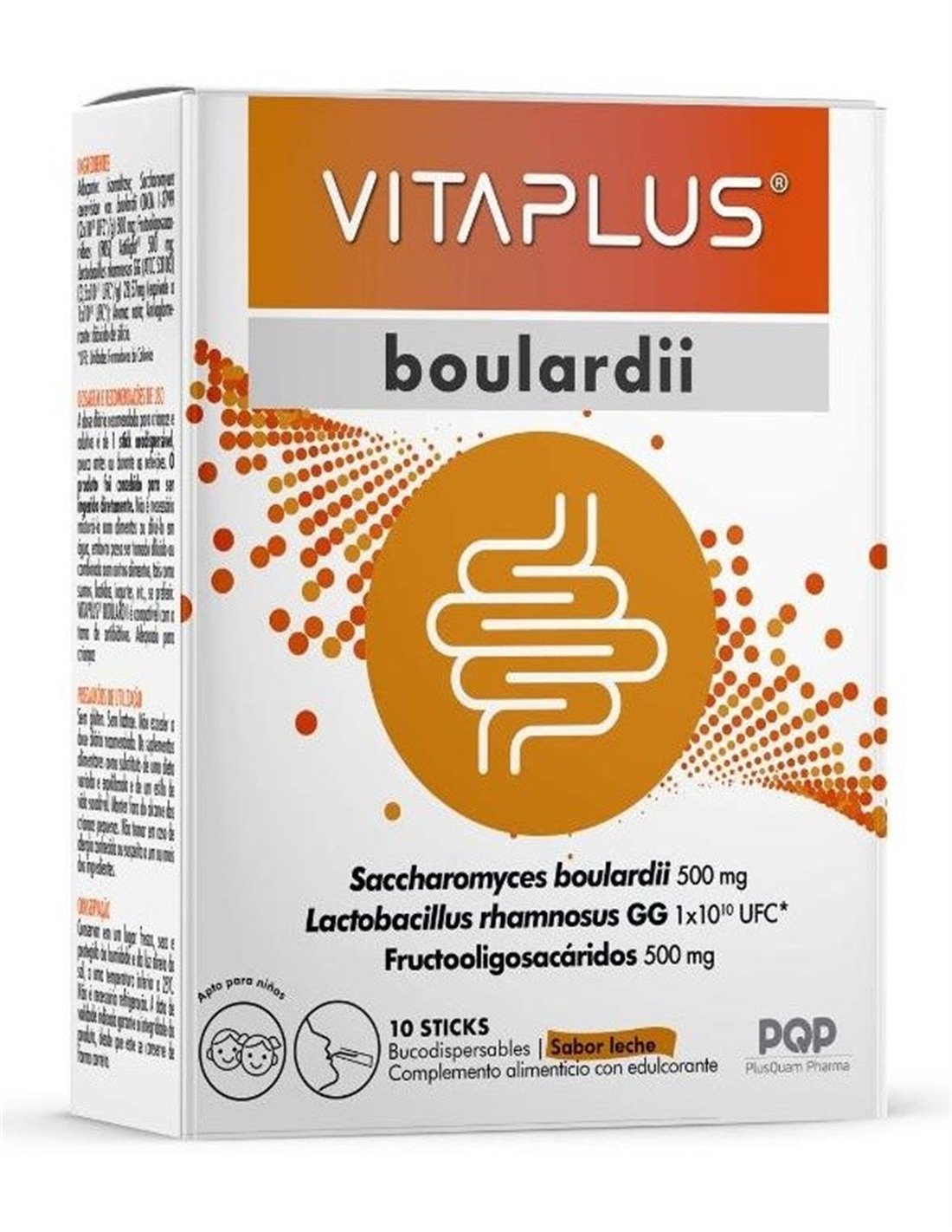 PLUSQUAMVitaplus® Boulardii combina 500 mg de una levadura probiótica denominada Saccharomyces boulardii CNCM I-3799, con 1x10(10) de la bacteria láctica Lactobacillus rhamnosus GG (ATCC 53103) y 500 mg de fructooligosacáridos (FOS-Actilight®). Saccharomyces boulardii y Lactobacillus rhamnosus GG son las 2 cepas probióticas más estudiadas y con mayor evidencia según las guías internacionales ESPGHAN y WGO, y se consideran de utilidad en caso de diarrea. VitaPLUS® Boulardii no contiene gluten ni lactosa, es apto para vegetarianos. Apto para embarazadas y compatible con la lactancia. Es compatible con la toma de antibióticos. Puede administrarse a niños a partir de los 3 años de edad.