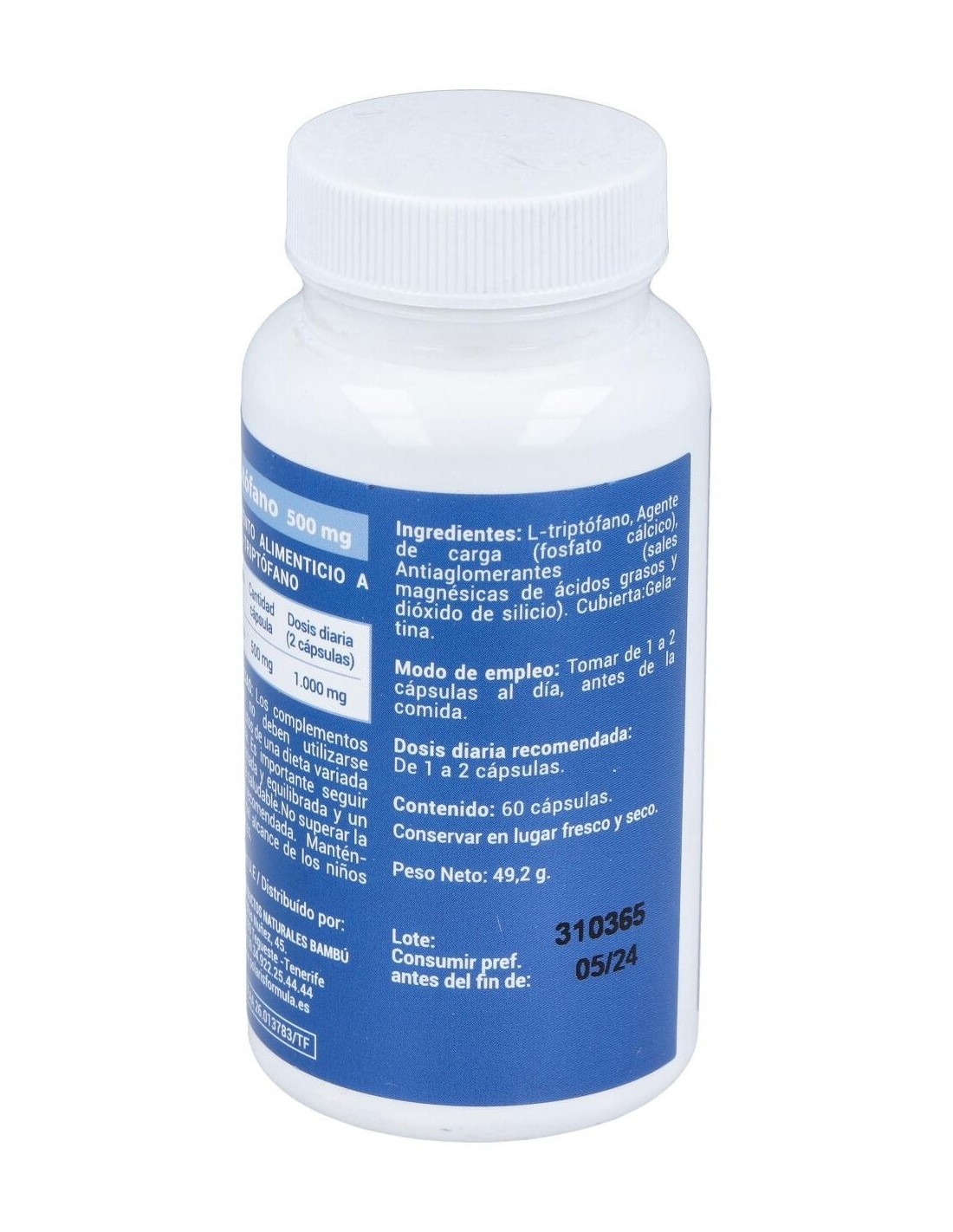 L-Triptófano 500 mg, agente de carga (fosfato cálcico), gelatina (envoltura), antiaglomerantes (estearato de magnesio y dióxido de silicio).