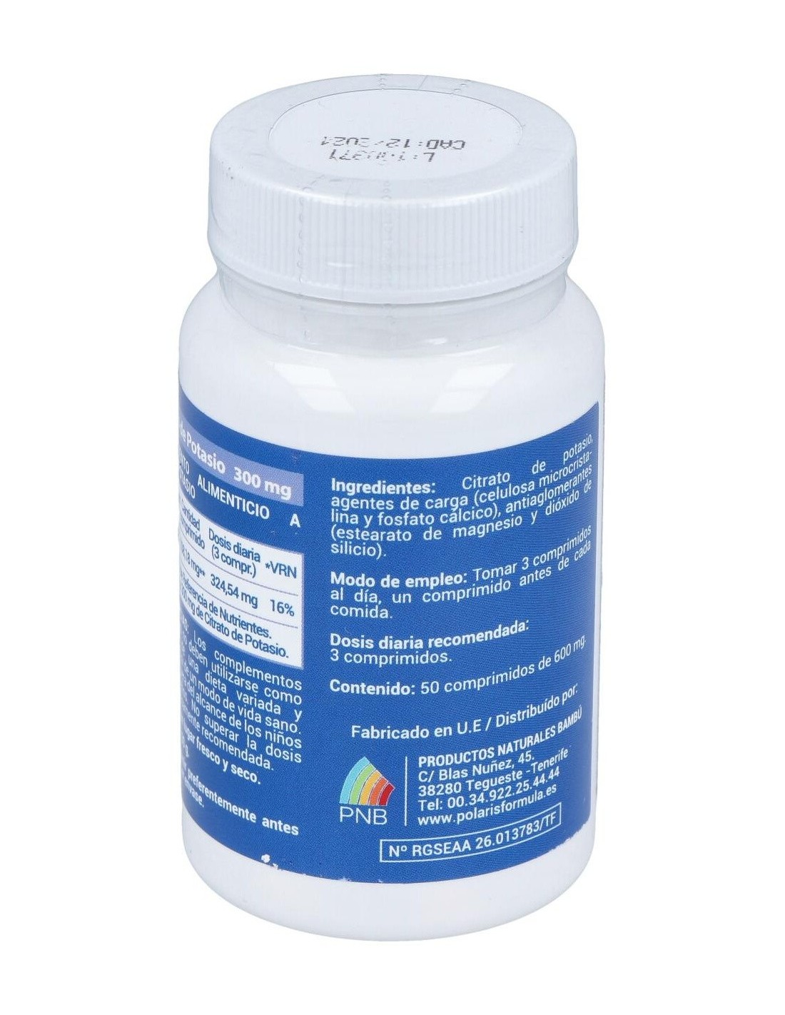 POLARISPolaris Citrato Potasio 300mg 50comp es un complemento alimenticio a base de potasio que ayuda a mantener el buen funcionamiento del sistema cardiovascular y renal.Modo de empleoTomar 3 comprimidos al día 1 antes de cada comida.