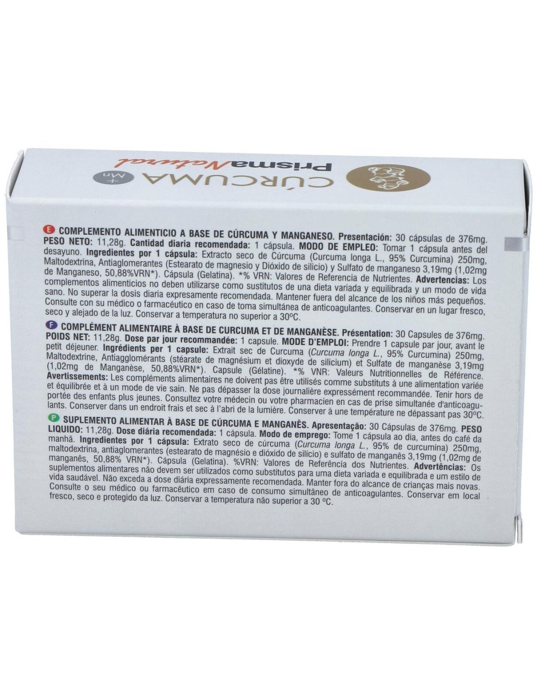 Cursol® 250mg (Corresponde A 2 Gramos De Cúrcuma (Cúrcuma Longa L.), Curcuminoides), Agente De Carga (Maltodextrina), Antiaglomerantes (Estearato De Magnesio Y Dióxido De Silicio) Y Sulfato De Manganeso 3,19mg (1mg De Manganeso, 50% Vrn*).