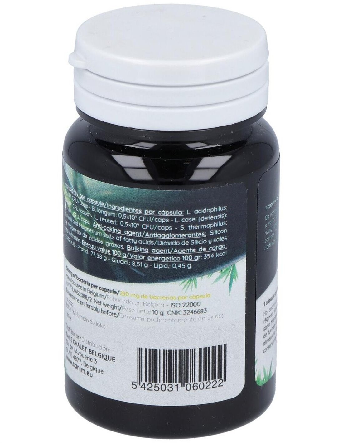 L. acidophilus : 2×109 UFC/g; B. longum : 2×109 UFC/g; L. casei (defensis) : 2×109 UFC/g; L. reuteri : 2×109 UFC/g; S. thermophilus : 2×109 UFC/g; Maltodextrine; Estearato de Magnesio; Dióxido de Silicio.