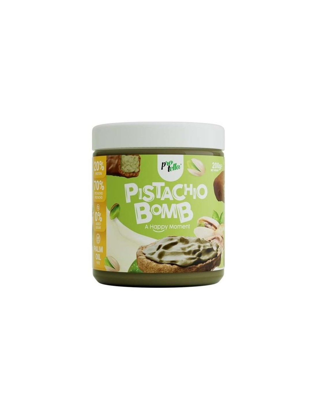 PROTELLACrema que contiene un alto porcentaje de frutos secos, un 70% de pistachos tostados. Con un 20% de proteína, no contiene ni azúcares añadidos ni aceite de palma. Gracias a su textura, es fácil de untar y se puede utilizar en tortitas, postres y recetas.