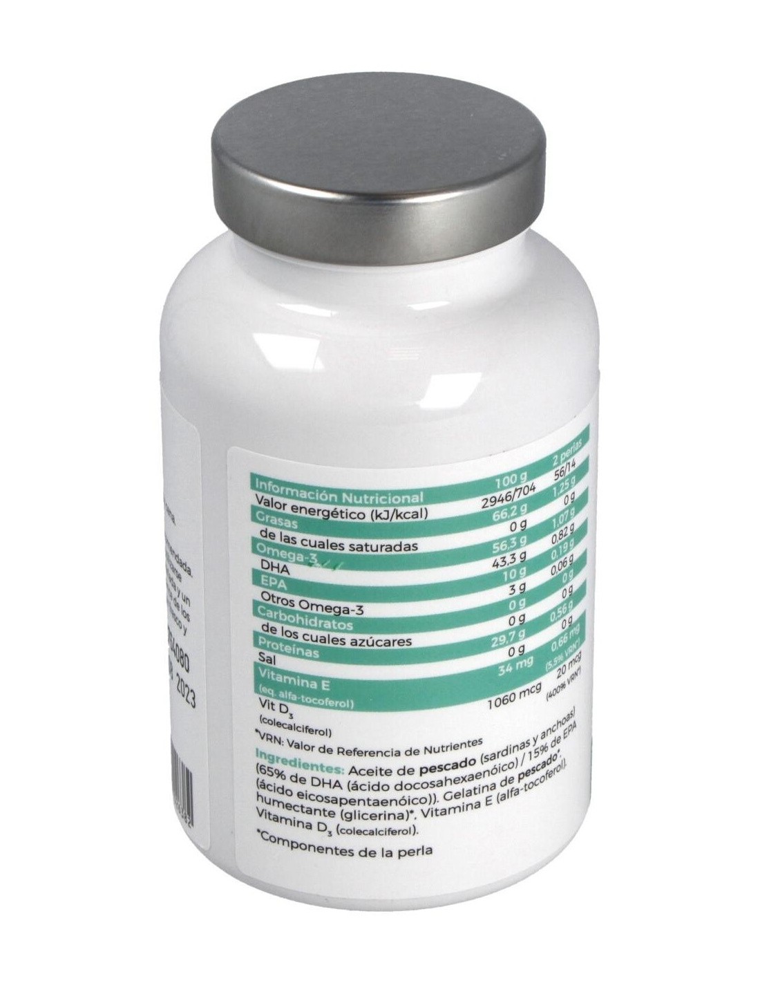 Aceite de pescado (sardinas y anchoas) [65% DHA (ácido docosahexaenoico) / 15% EPA (ácido eicosapentaenoico)] Gelatina de pescado, Humectante (glicerina), Vitamina E (alfa-tocoferol), Vitamina D3 (colecalciferol).