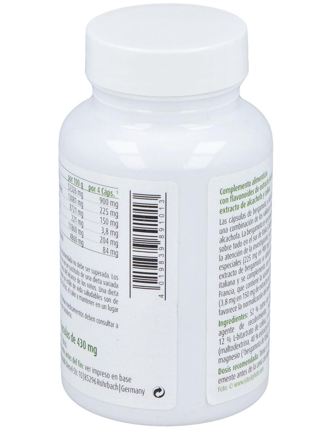 52% extracto de bergamota de Italia (75% zumo de extracto de bergamota, maltodextrina), recubrimiento: hidroxipropilmetilcelulosa, 12% L-bitartrato de colina, 9% extracto de alcachofa* (maltodextrina3, 40% extracto de alcachofa*), estearato de magnesio.