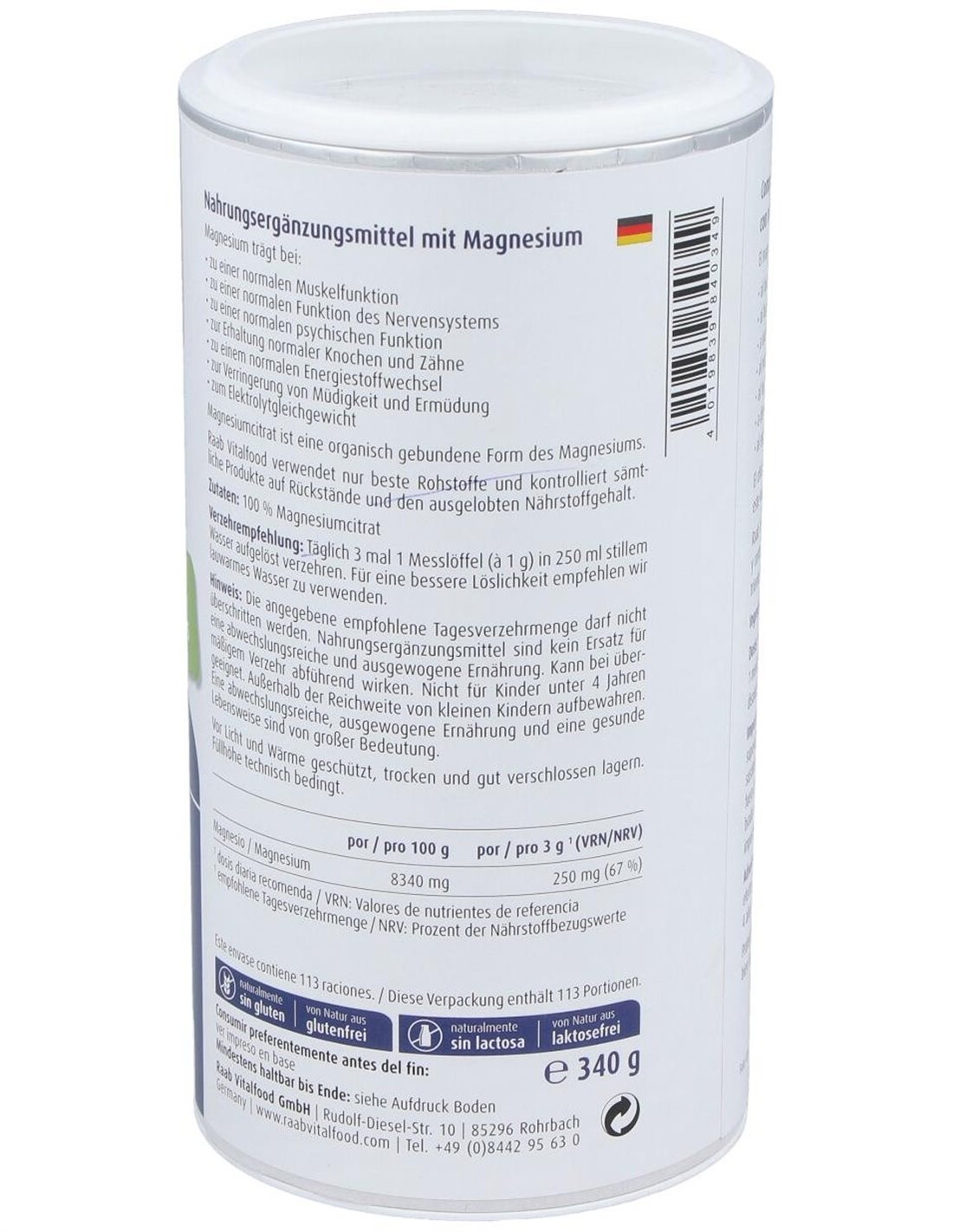 RAAB VITALFOODComplemento alimenticio con magnesio. Apoyo para los músculos y huesos en condiciones normales, para el sistema nervioso normal y para el equilibrio electrolítico.