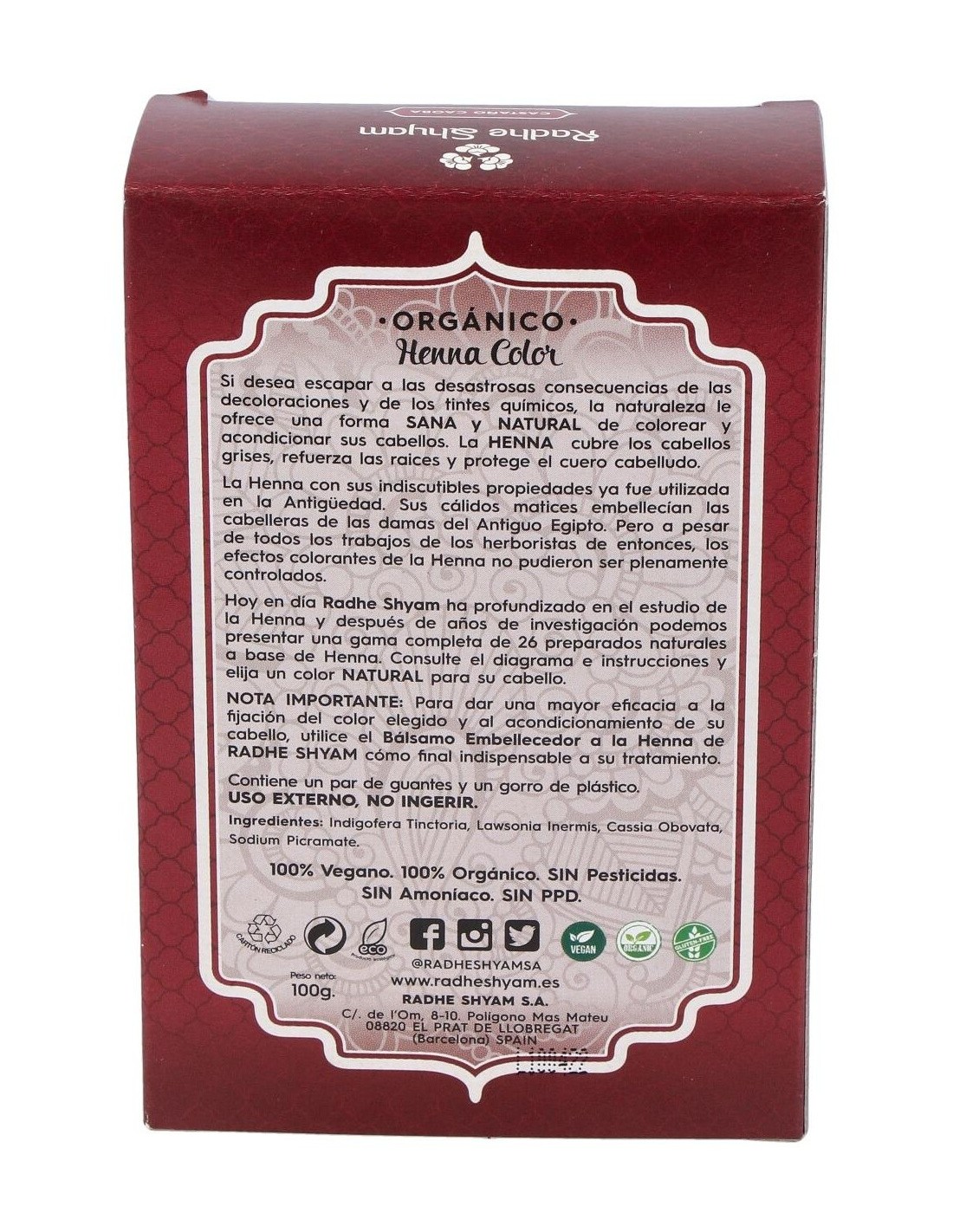 RADHE SHYAMTinte Natural para el pelo a base de plantas, que cuida y nutre la piel, del que se obtiene un color castaño con un tono rojizo. Apto para veganos.