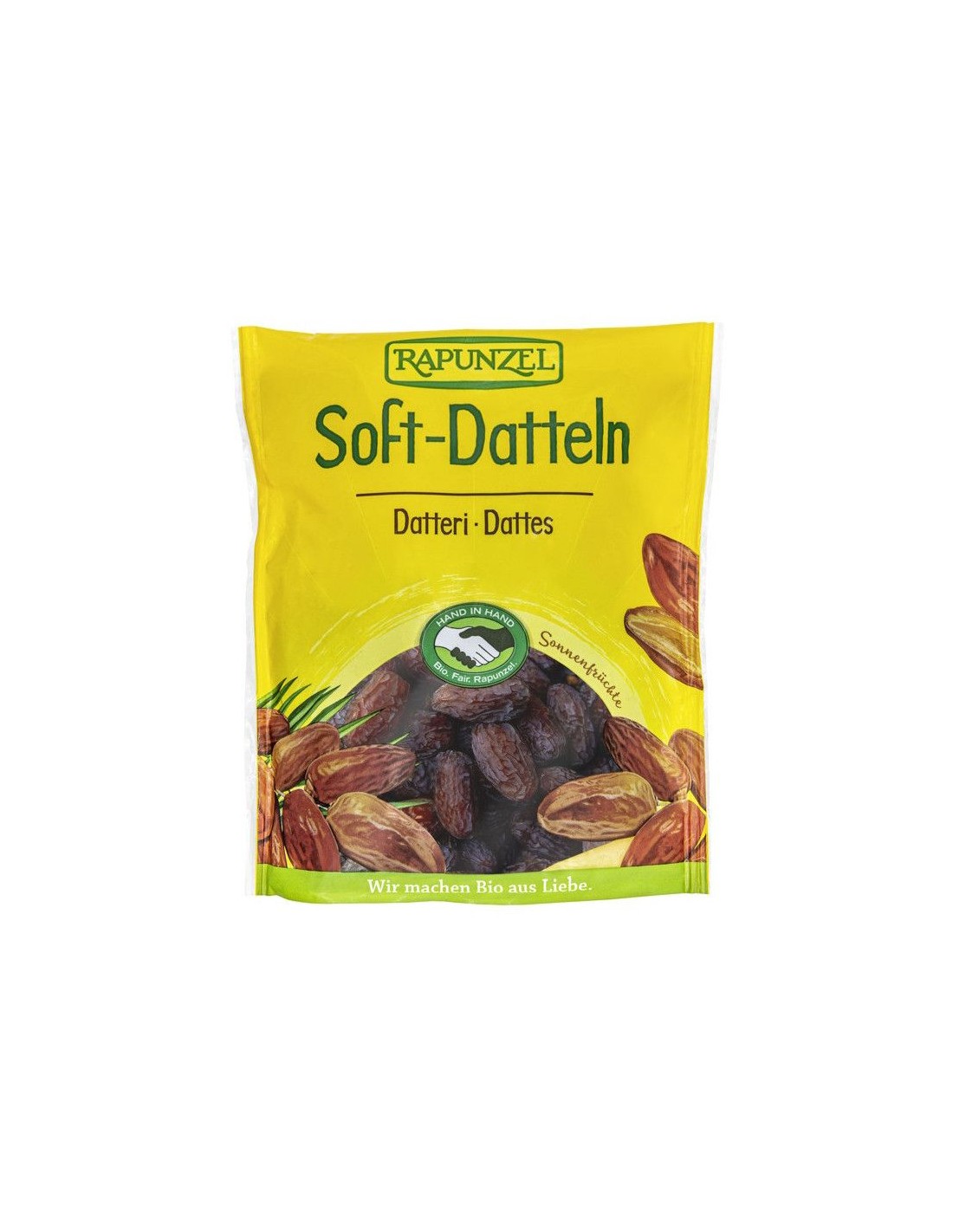 RAPUNZELDátiles blandos sin hueso Provienen del programa Hand in Hand que une la agricultura biológica y el comercio justo Los aromáticos dátiles ya secos son suavemente rehidratados con vapor de agua y convertidos en dátiles blandos. Ocasionalmente es posible encontrar algún trozo de hueso en la fruta.