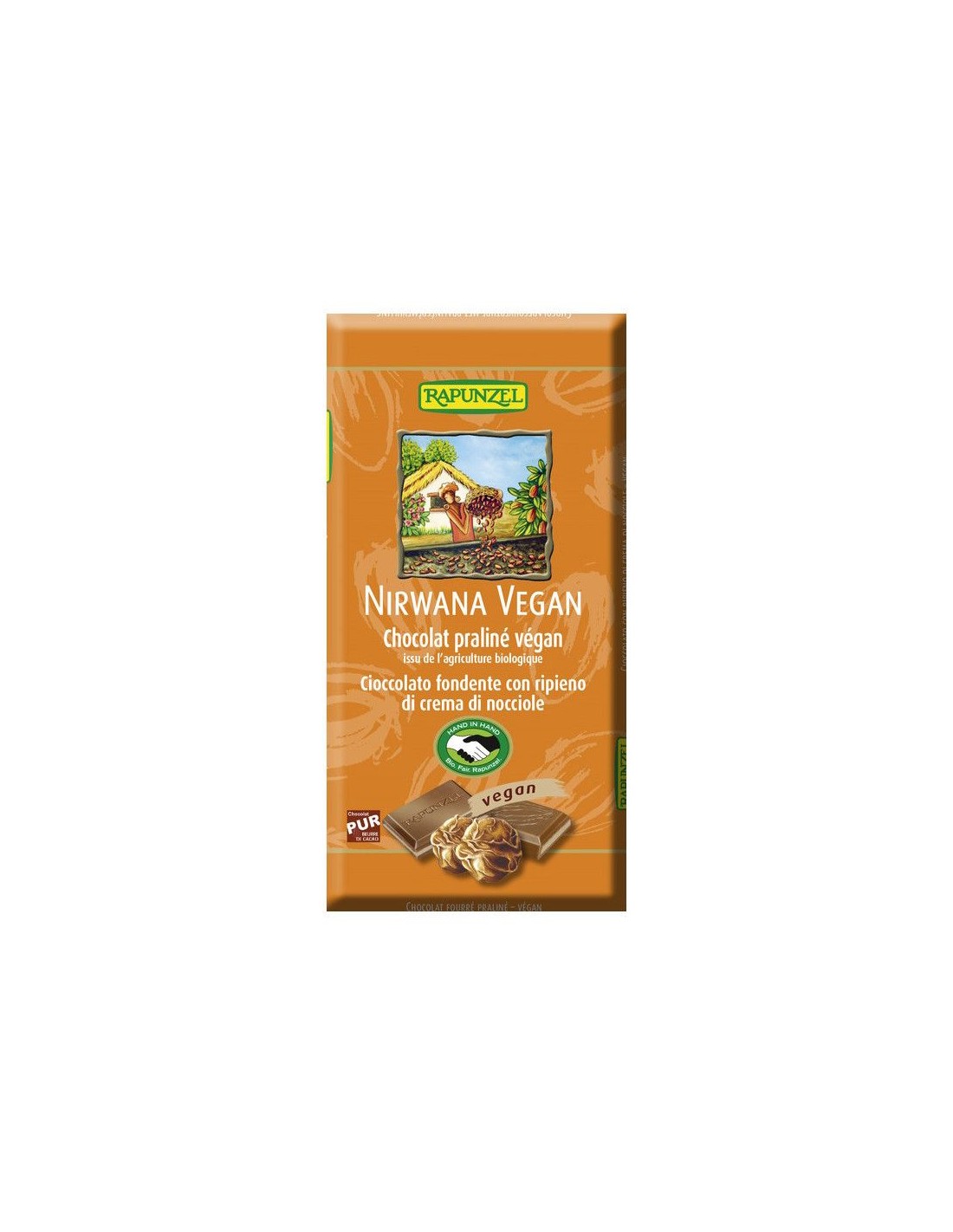 RAPUNZELDeliciosa tableta de chocolate negro, de cremoso y exquisito praliné. Con ingredientes de comercio justo. Además de las materias primas seleccionadas, el conchado es el verdadero secreto de un chocolate. El conchado es un arte que desarrolla plenamente la riqueza de sabores inherentes al cacao en un proceso paso a paso que proporciona al chocolate la finura perfecta y delicada.