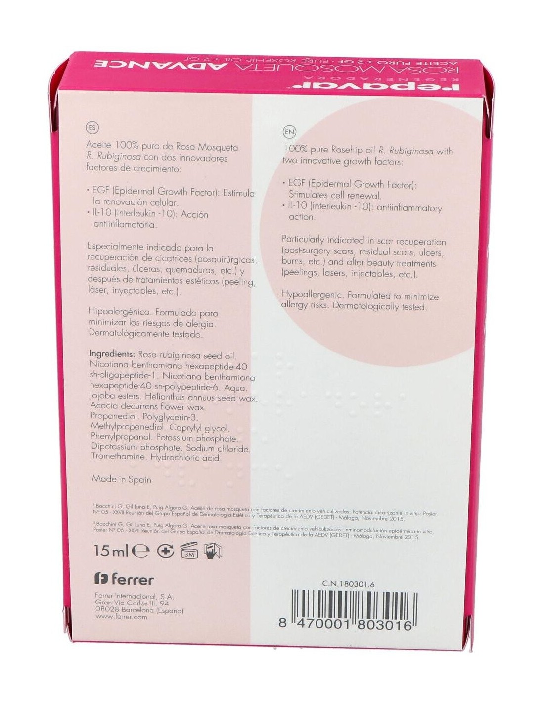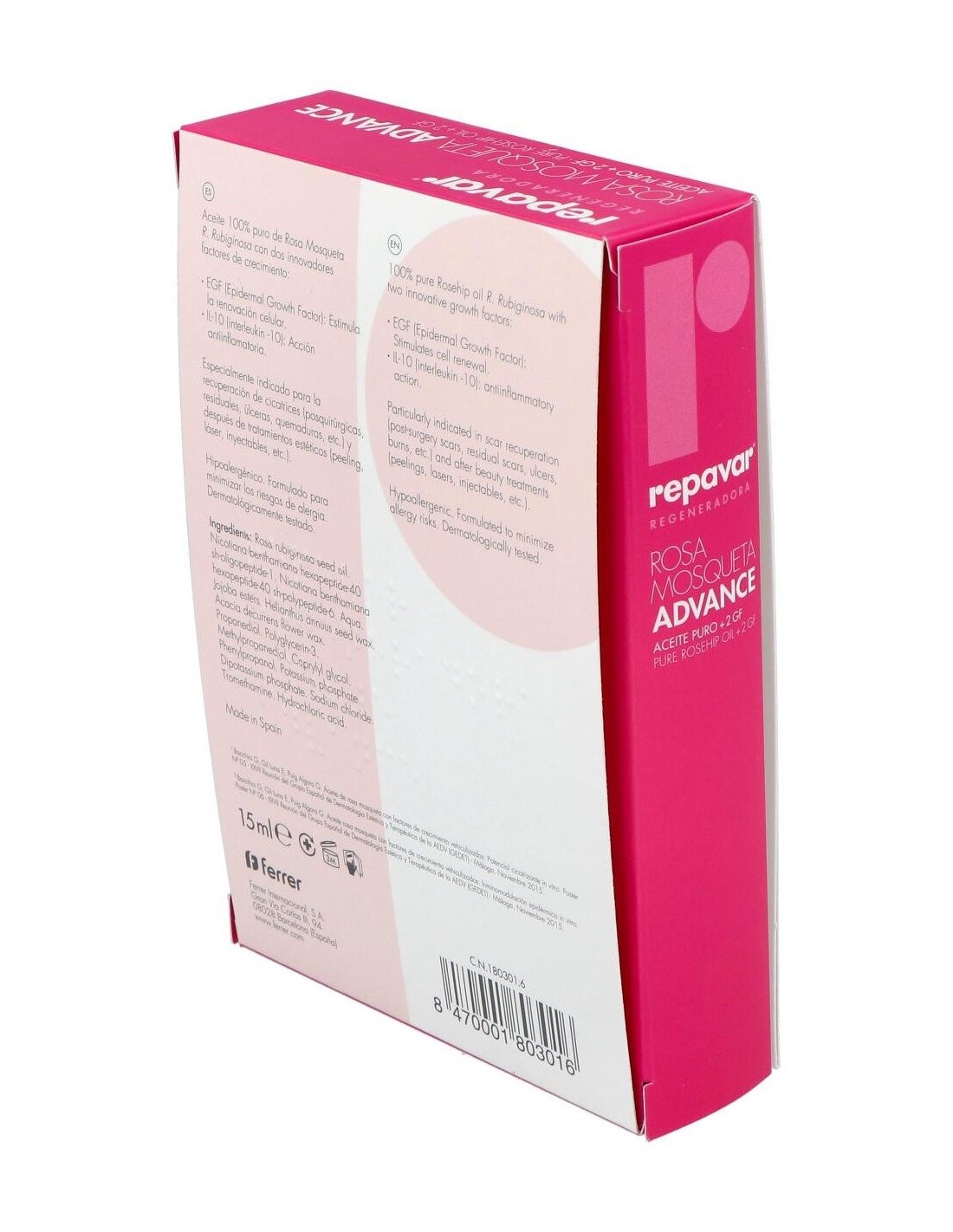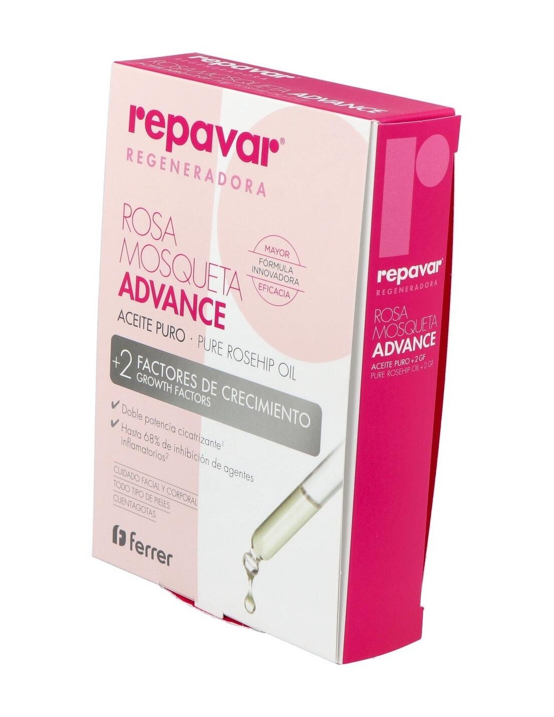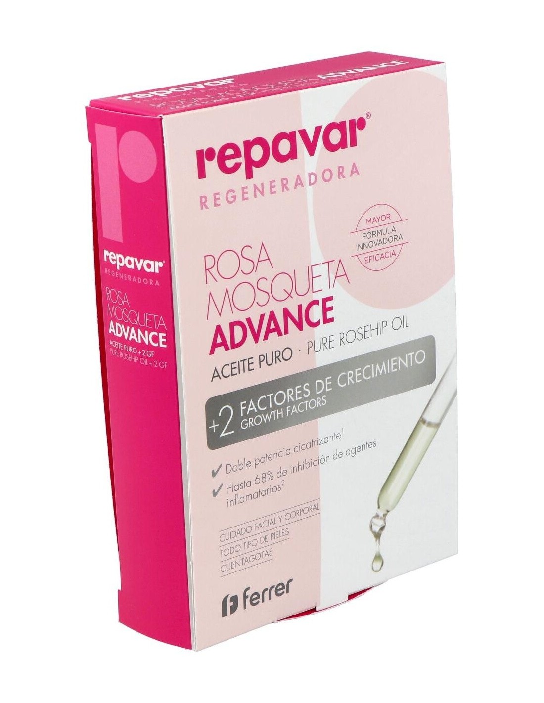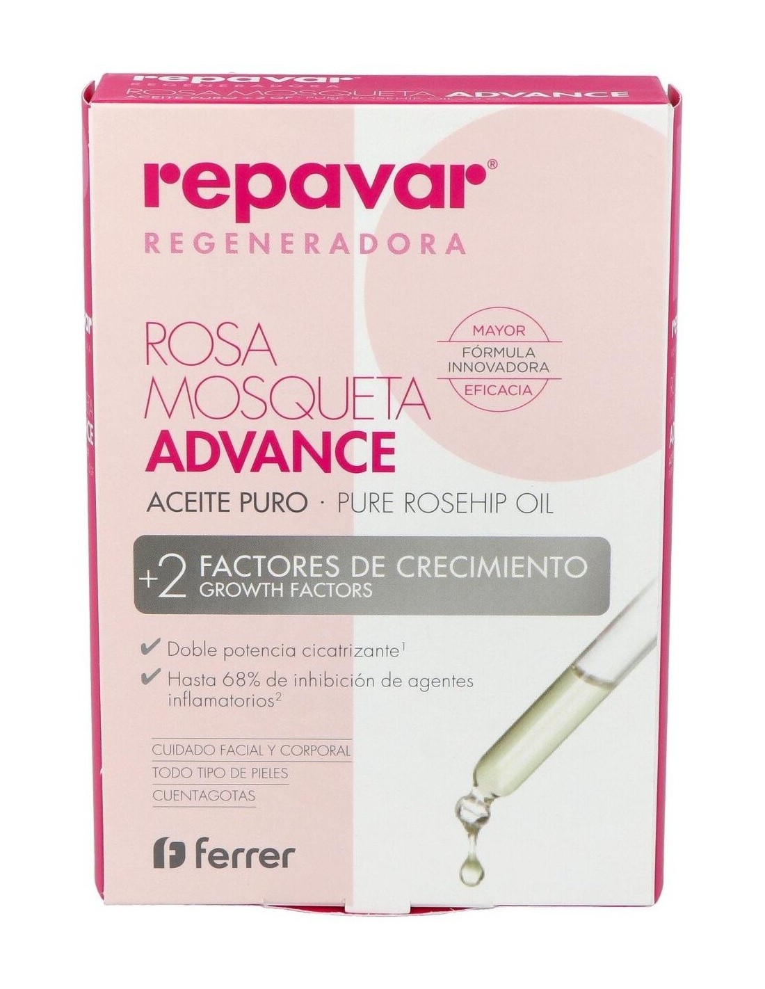 El aceite de rosa mosqueta Advance de Repavar es un aceite con propiedades cicatrizantes y antiinflamatorias que luchan contra las imperfecciones de la piel (arrugas, manchas, estrías, celulitis, úlceras, quemaduras...). Con Repavar podrás atenuar todas estas imperfecciones, al mismo tiempo que hidratas y le devuelves la elasticidad a la piel. Contiene un alto poder regenerante gracias a sus principios activos que mejoran la cicatrización y restauran la piel desde el interior. Es eficaz, también, para aliviar la piel sometida a tratamientos estéticos como peeling, láser o inyectables.