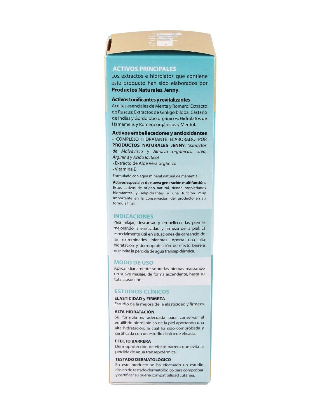 Extracto de Ginkgo Biloba, Extracto de Ruscus, Extracto de Castaño de Indias, Extracto de Gordolobo, Destilado de Hojas de Hamamelis, Destilado de Flores de Romero, Aloe Vera, Vitamina E.