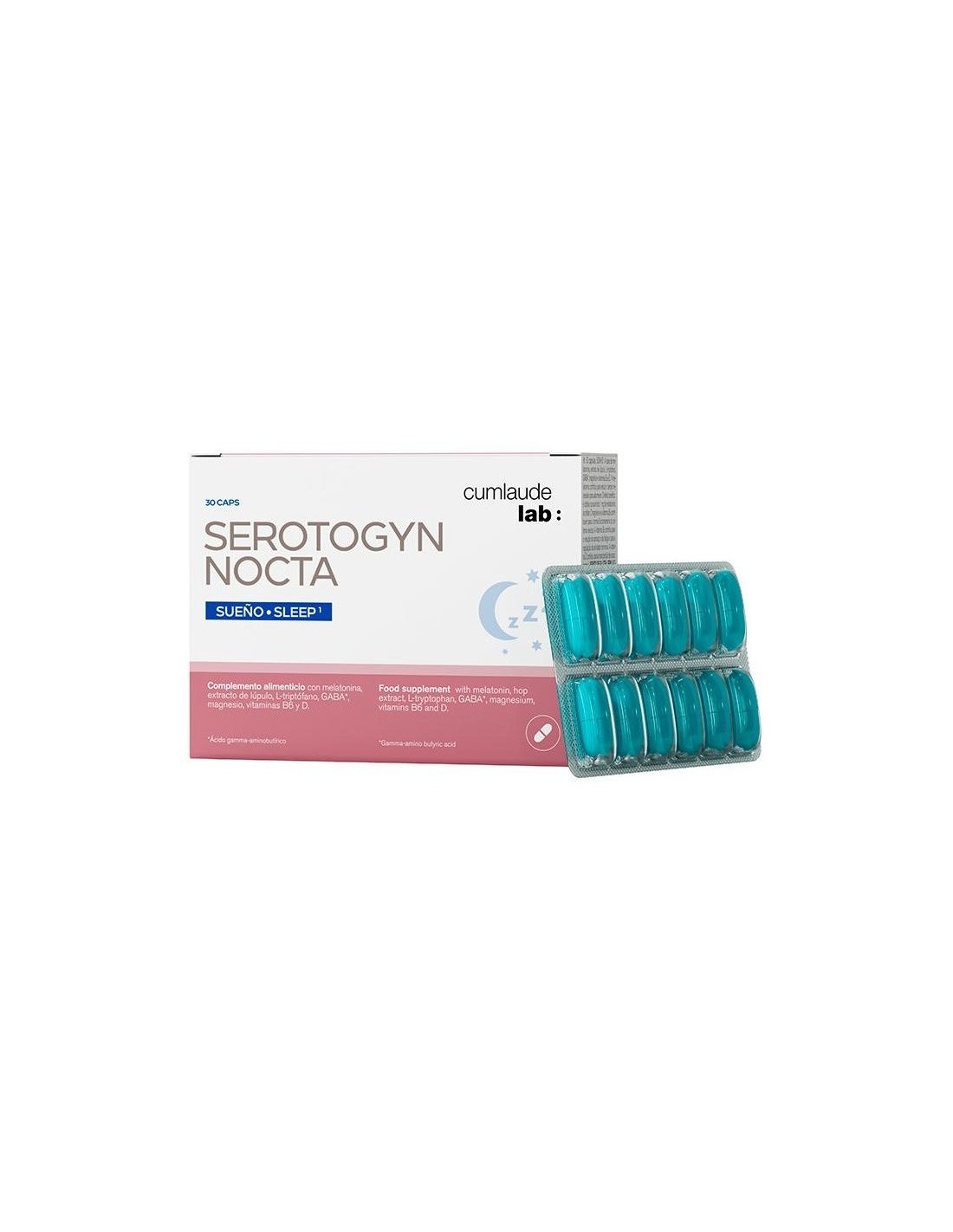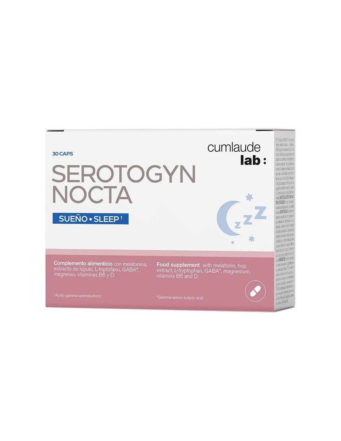 Cumlaude Serotogyn Nocta 30caps es un complemento alimenticio a base de melatonina, extracto de lúpulo, L-triptófano, GABA, magnesio, vitaminas B6 y D.